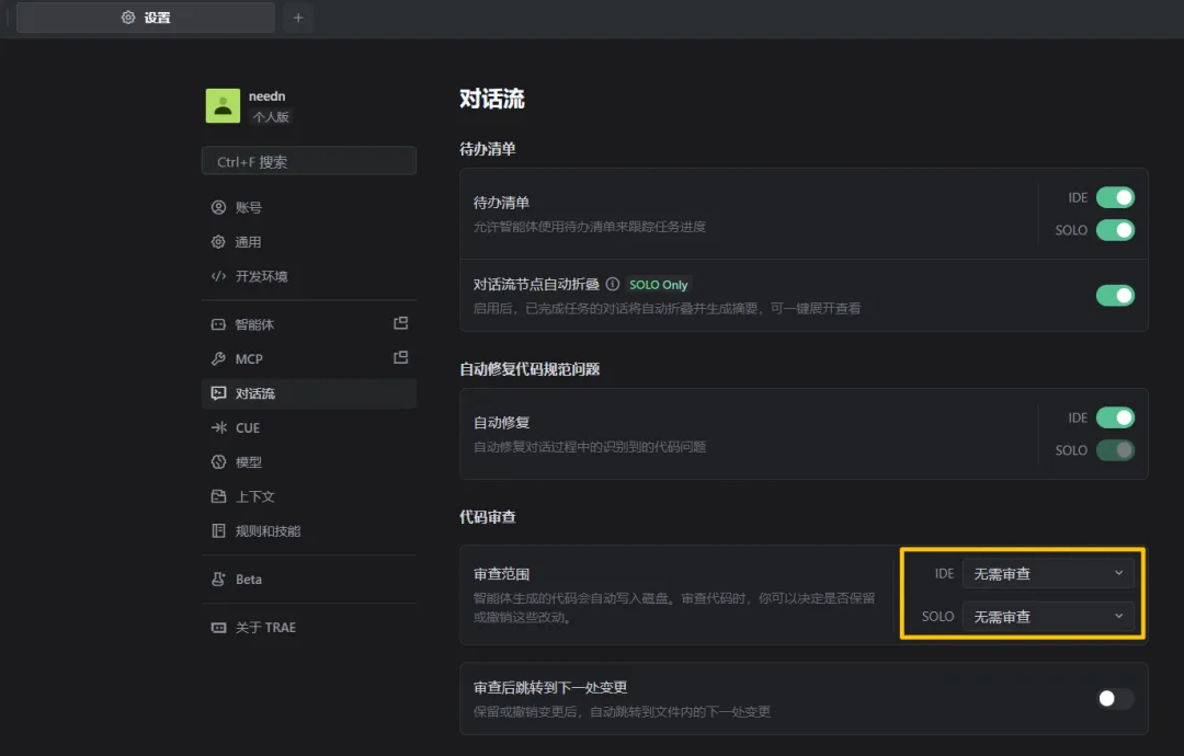 首先环境准备下载腾讯的CodeBuddy https://copilot.tencent.com 或字节的TRAE https://www.trae.cn 安装并注册会员后才能使用。(安装步骤略)TRAE中可以设置代码审查,改为无需审查。这样AI生成的文本不需要人工逐一确认接受。小说创作开始