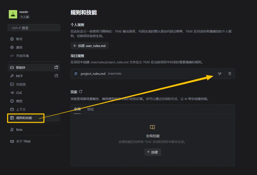 首先让TRAE打开一个空文件夹作为项目的工作空间。创建Rules(项目规则)。Rules中描述了本项目的基本背景,规定了AI如何按要求去进行小说创作。简单地说就是最高级别的系统提示词,AI每次干活时都会去打开这个Rules遵循其中的指令。Rules文件解释了项目的基本文件目录结构,具体小说的写法要如何找到并遵守SPEC(说明书)进行完成,其完整定义如下- 本工程小说通过双层SPEC方法,由AI逐章节创作,SPEC文件夹中所有文件均为AI阅读,需设计完整但简洁而清晰明了