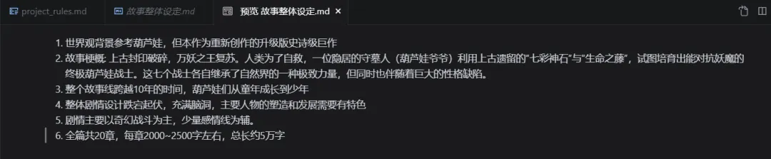 SPEC分为两类,Me2AI SPEC是人类向AI下达的基本指示,说明了小说内容的需求。创建以下3个指定的文件,然后输入小说的基本设定,读者也可自行更改。md文件格式不是必须的,只是让AI阅读起来结构层次更分明,使用普通txt文本也可以。我的故事整体设定内容如下图