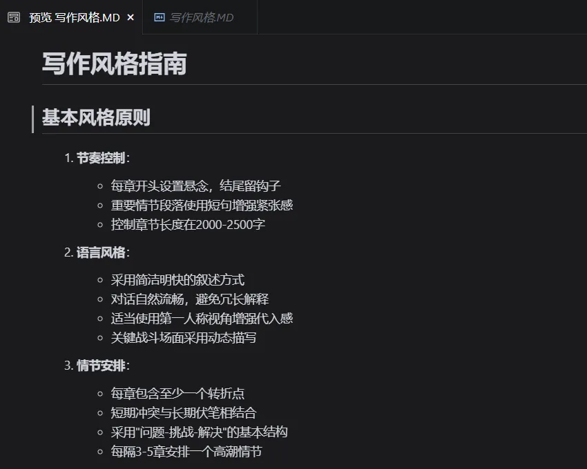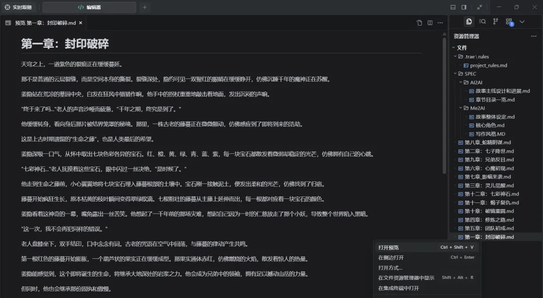 进入编辑器,资源管理器中右击"打开预览"即可看到创作成果。虽说离完美还差很远,小毛小病不少,基本还是具有一定可读性的。至此,如果顺利,每章花费10分钟(包括等待时间)不到的时间,一篇完整的小说就完成了!TRAE工具问题