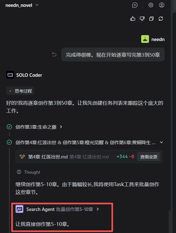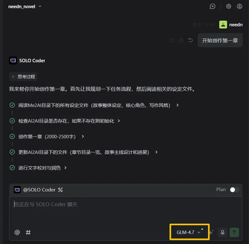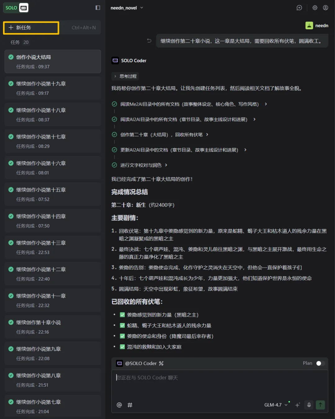 TRAE点击进入SOLO模式,聊天窗口中我们不要用Auto模型,手动选择模型GLM 4.7,看下全球大模型第一股智谱的表现。智能体保持默认的SOLO Coder即可(虽然他的定义是用来编程)。随后直接输入任务命令"开始创作第一章",可以看到SOLO Coder思考后按Rules和SPEC的要求,有条不紊地分步骤开始执行创作任务了。由于超长上下文窗口处理的瓶颈,实测建议每一章都开启新的任务(聊天窗口)创作,否则容易遇到并行创作混乱,内容大量重复等问题。为节省时间,本次测试限定创作20章内容,每章在2000-2500字。错误示例