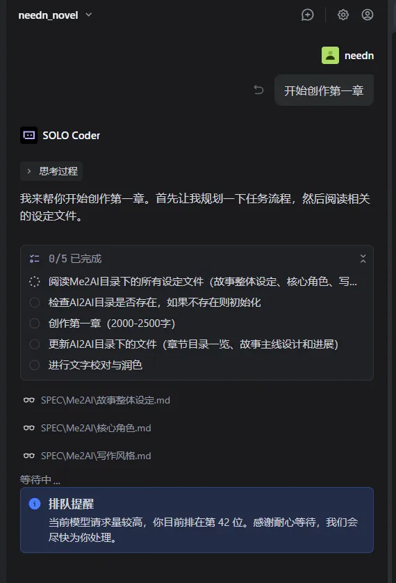 第一次测试时,睡觉前我想让他彻夜直接写完50章。结果就开始并行章节输出,AI可会偷懒了,最终效果造成内容大量重复和冲突。运行时可能会遇到排队问题,高峰期可能需要几分钟的耐心等待。工作效果观察