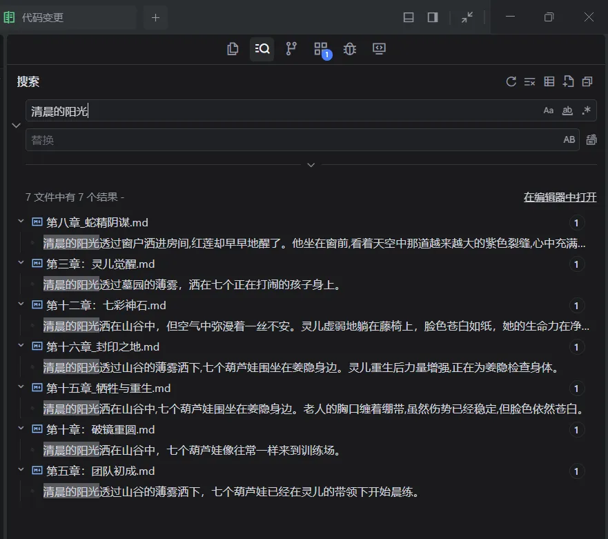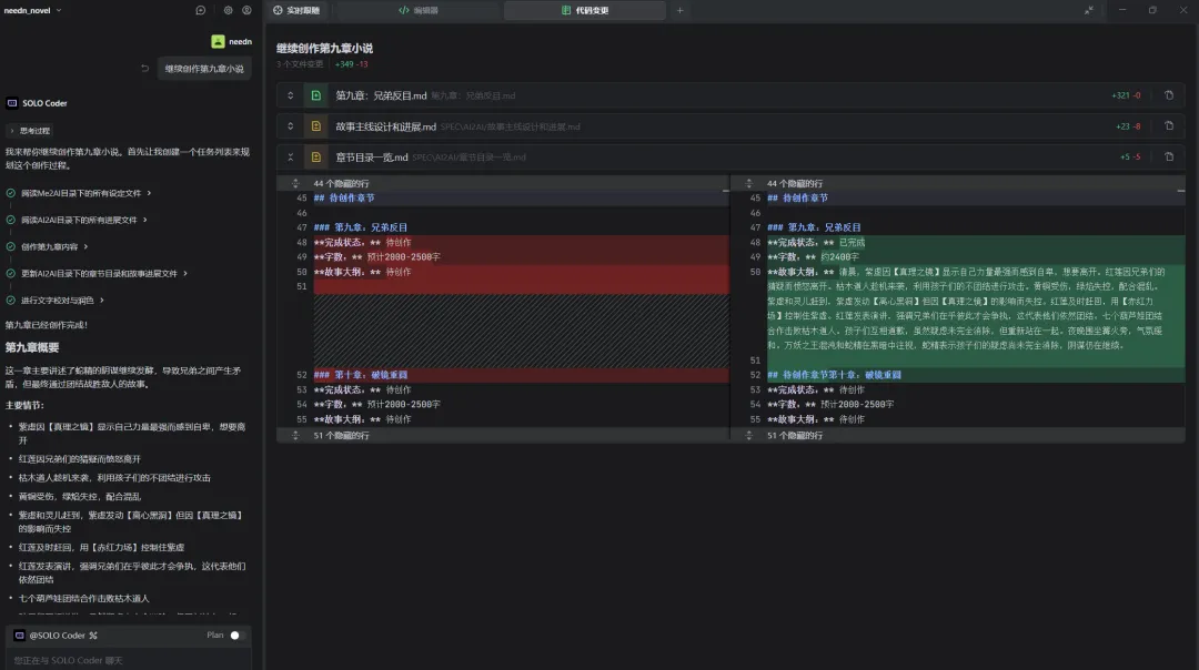 每次创作完成后,进入代码变更页面,可以看到AI不仅创作了新的章节,还按要求更新了章节目录和故事进展,为下一章创作做好准备。成果预览