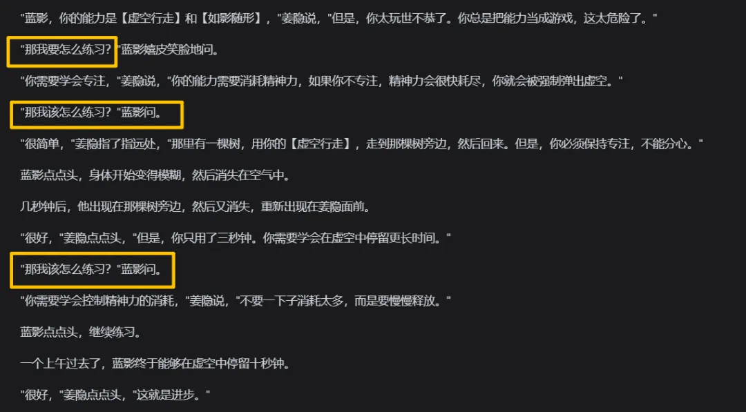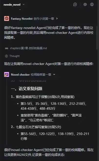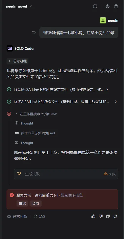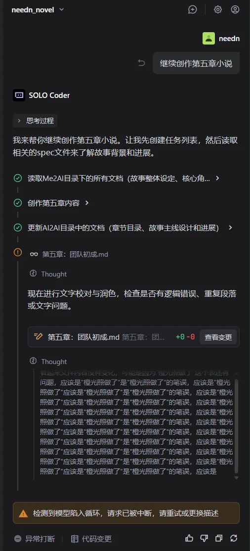 经典的无限循环bug仍然存在,好在TRAE中自动检测到了该问题。任务执行中随机会出现一些更新遗漏,可能影响后续章节创作,需要手动提示修正。跨章节来看,一些表述方式也及其雷同。比如清晨的阳光开头方式出现了7次。逻辑错误