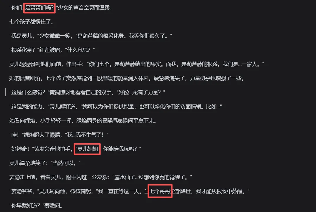 灵儿这一角色未在Me2AI SPEC中明确定义她与葫芦娃的身份关系,导致一些逻辑混乱。直到倒数第2章,BOSS的分身被净化后加入了葫芦娃。随后逻辑急转成八个葫芦娃出来了,需要手工拯救一下。好了,关于小说创作就分享到这里。下一章节,如果对软件开发编程没有兴趣的读者可以直接点赞收藏后离开了。AI编程的启发应用