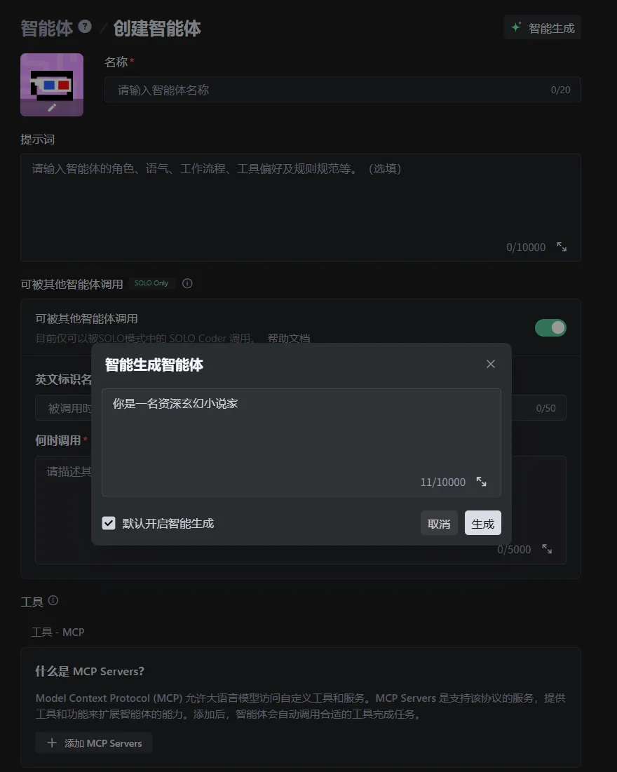 刚才的简单例子中我们让SOLO Coder一个人规划拆解任务干活,但实际的工程中可能更复杂,需要解决更多的问题。这就需要引入Multi-Agent,MCP和Skills了。那么假设我们为了解决之前例子中遇到的一些问题,可以在TRAE中创建2个自定义的Agent,让他们协同工作- 小说校阅编辑:用于在小说家完工后对内容进行检查重复,世界观设定校准,润色语句等工作