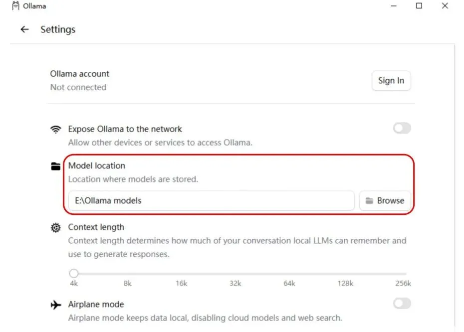 1.电脑桌面右下角点击ollama,选择setting2.在下图“Model location”处修改模型下载储存路径(以后下载的本地大模型则储存在此路径),我就选择在e盘新建一个名为“Ollama models”的文件夹,用于存储(注意这里是需要先手动在e盘新建好名为“Ollama models”的文件夹后,才可以选择)步骤3:模型拉取至本地(下载开源大模型至本地使用)