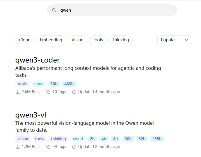 1.在上方search框内输入你想要的开源模型,选择对应参数下载(这里以qwen-coder系列为例,搜索qwen,然后点击第一个“qwen3-coder”),如下图所示: