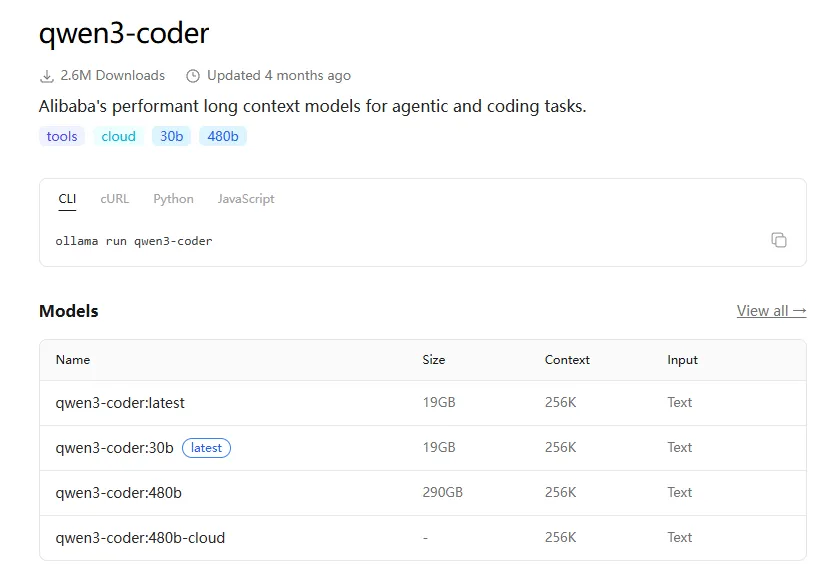 2.如下图所示,可以看到“qwen3-coder”这个模型有不同参数版本可供下载,模型后缀30b、480b这些就是参数量的大小,越大则模型越牛,但所需硬件条件就越高