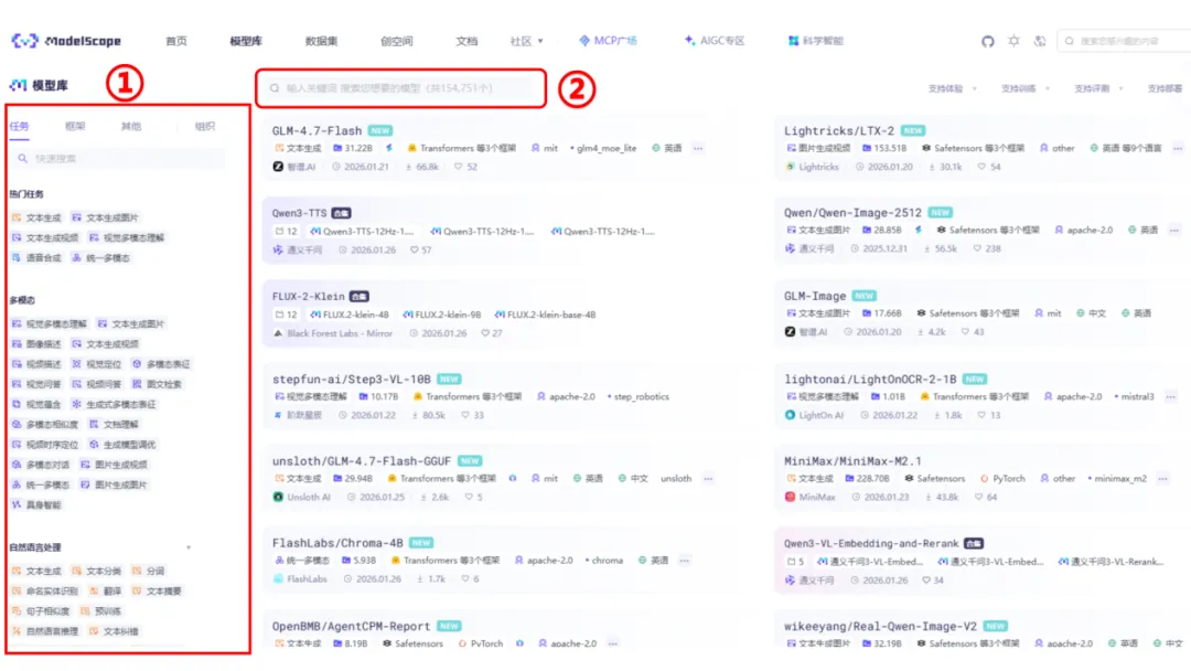 如上图所示,打开官网,搜索想要的模型:①部分为模型功能分类,②部分搜索框可以输入想要的开源模型系列,如“deepseek”“Qwen”等