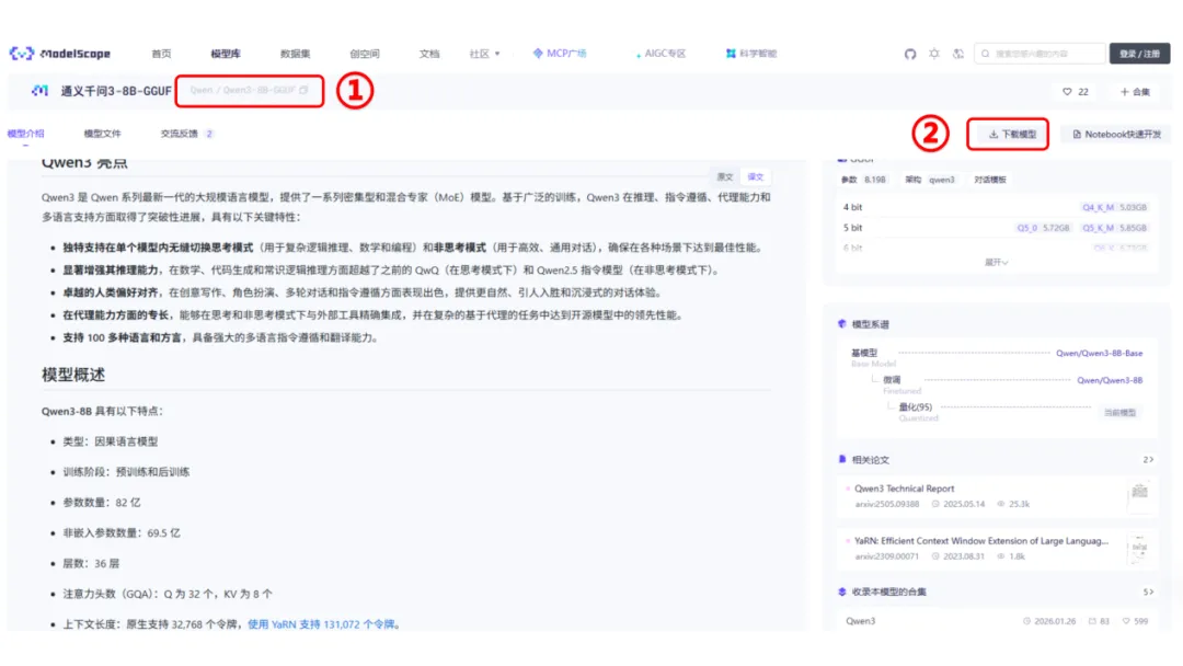 我们以图中“通义千问3-8B-GGUF”模型为例,点开对应模型链接,