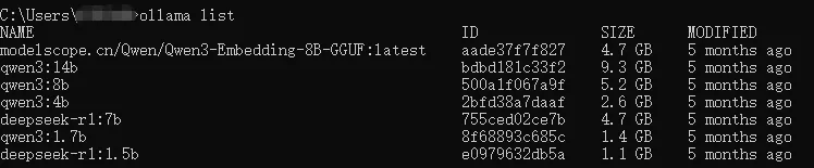 再次输入ollama list查看,可以看到原来名称为“modelscope.cn/Qwen/Qwen3-Embedding-8B-GGUF:latest”的模型已被删除,如下图所示: