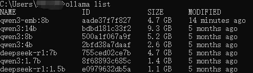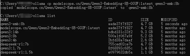 可以看到多了一个名为“qwen3-emb:8b”,它相当于创建了一个新的“模型标签”(tag),让它指向和原模型完全相同的底层数据。类似给一个人办了两张身份证(名字不同,但人是同一个),此步骤不会额外占用磁盘空间(不是复制粘贴了一个大模型然后改名字,无须担心)