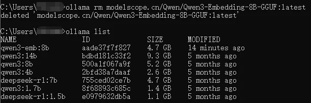ollama rm modelscope.cn/Qwen/Qwen3-Embedding-8B-GGUF:latest