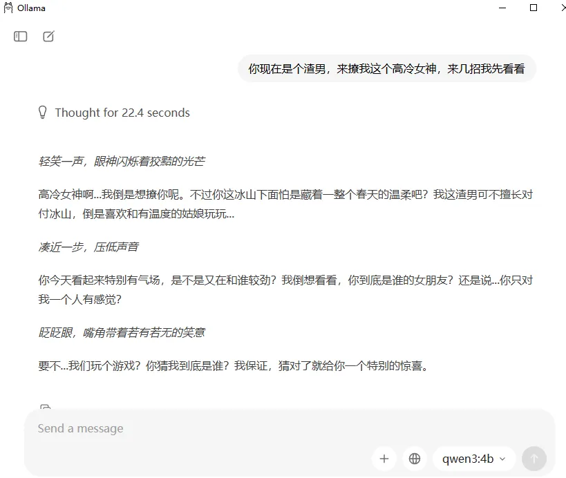 右下角找到ollama,右键点击“Open Ollama”,打开后在右下角选择你下载好的模型,即可使用,这里以我提前下载好的“qwen3:4b”模型为例
