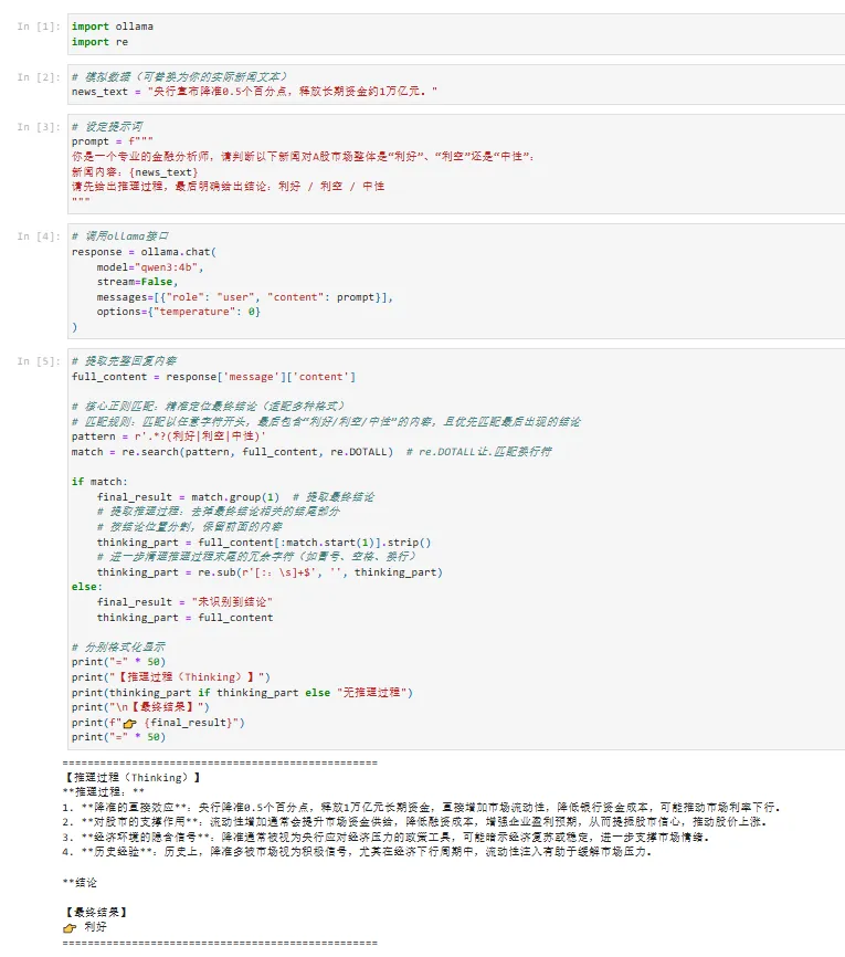 import ollamaimport re# 模拟数据(可替换为你的实际新闻文本)news_text = "央行宣布降准0.5个百分点,释放长期资金约1万亿元。"# 设定提示词prompt = f"""你是一个专业的金融分析师,请判断以下新闻对A股市场整体是“利好”、“利空”还是“中性”:新闻内容:{news_text}请先给出推理过程,最后明确给出结论:利好 / 利空 / 中性"""# 调用ollama接口response = ollama.chat( model="qwen3:4b", stream=False, messages=[{"role": "user", "content": prompt}], options={"temperature": 0})# 提取完整回复内容full_content = response['message']['content']# 核心正则匹配:精准定位最终结论(适配多种格式)# 匹配规则:匹配以任意字符开头,最后包含“利好/利空/中性”的内容,且优先匹配最后出现的结论pattern = r'.*?(利好|利空|中性)'match = re.search(pattern, full_content, re.DOTALL) # re.DOTALL让.匹配换行符if match: final_result = match.group(1) # 提取最终结论 # 提取推理过程:去掉最终结论相关的结尾部分 # 按结论位置分割,保留前面的内容 thinking_part = full_content[:match.start(1)].strip() # 进一步清理推理过程末尾的冗余字符(如冒号、空格、换行) thinking_part = re.sub(r'[::\s]+$', '', thinking_part)else: final_result = "未识别到结论" thinking_part = full_content# 分别格式化显示print("=" * 50)print("【推理过程(Thinking)】")print(thinking_part if thinking_part else "无推理过程")print("\n【最终结果】")print(f"👉 {final_result}")print("=" * 50)