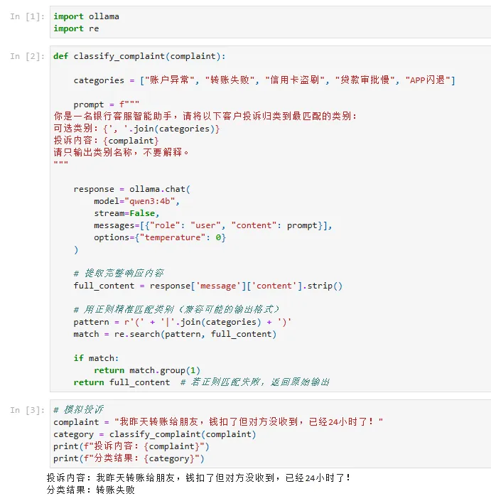 import ollamaimport redef classify_complaint(complaint): categories = ["账户异常", "转账失败", "信用卡盗刷", "贷款审批慢", "APP闪退"] prompt = f"""你是一名银行客服智能助手,请将以下客户投诉归类到最匹配的类别:可选类别:{', '.join(categories)}投诉内容:{complaint}请只输出类别名称,不要解释。""" response = ollama.chat( model="qwen3:4b", stream=False, messages=[{"role": "user", "content": prompt}], options={"temperature": 0} ) # 提取完整响应内容 full_content = response['message']['content'].strip() # 用正则精准匹配类别(兼容可能的输出格式) pattern = r'(' + '|'.join(categories) + ')' match = re.search(pattern, full_content) if match: return match.group(1) return full_content # 若正则匹配失败,返回原始输出# 模拟投诉complaint = "我昨天转账给朋友,钱扣了但对方没收到,已经24小时了!"# 调用函数category = classify_complaint(complaint)print(f"投诉内容:{complaint}")print(f"分类结果:{category}")