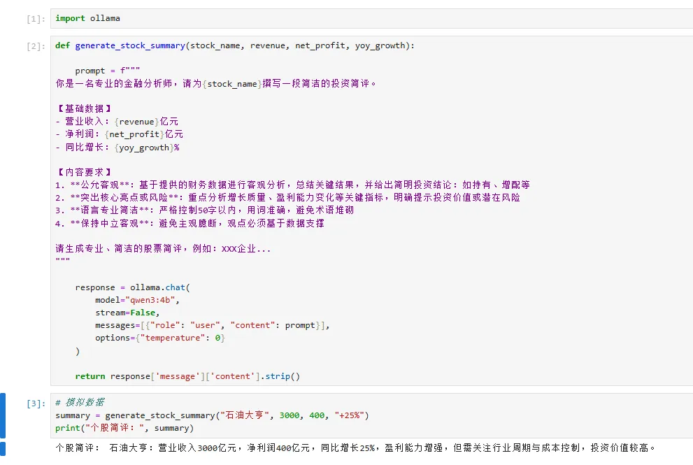 import ollamadef generate_stock_summary(stock_name, revenue, net_profit, yoy_growth): prompt = f"""你是一名专业的金融分析师,请为{stock_name}撰写一段简洁的投资简评。【基础数据】- 营业收入:{revenue}亿元- 净利润:{net_profit}亿元- 同比增长:{yoy_growth}%【内容要求】1. **公允客观**:基于提供的财务数据进行客观分析,总结关键结果,并给出简明投资结论:如持有、增配等2. **突出核心亮点或风险**:重点分析增长质量、盈利能力变化等关键指标,明确提示投资价值或潜在风险3. **语言专业简洁**:严格控制50字以内,用词准确,避免术语堆砌4. **保持中立客观**:避免主观臆断,观点必须基于数据支撑 请生成专业、简洁的股票简评,例如:XXX企业...""" response = ollama.chat( model="qwen3:4b", stream=False, messages=[{"role": "user", "content": prompt}], options={"temperature": 0} ) return response['message']['content'].strip()# 模拟数据summary = generate_stock_summary("石油大亨", 3000, 400, "+25%")print("个股简评:", summary)