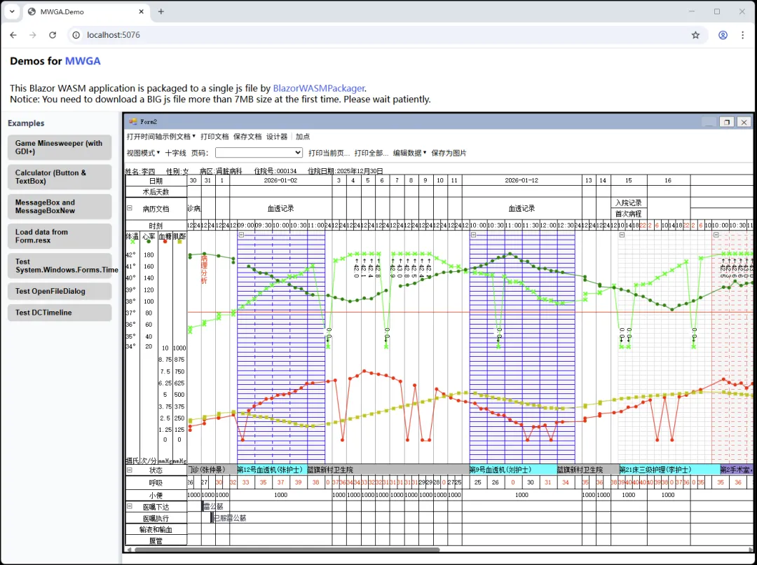 MWGA内部还模拟实现了Win32 Message loop和消息队列,构造出了一个Winforms的底层运行框架,使得用户的基于Winforms的C#代码重新编译后即可运行在Blazor WASM上。