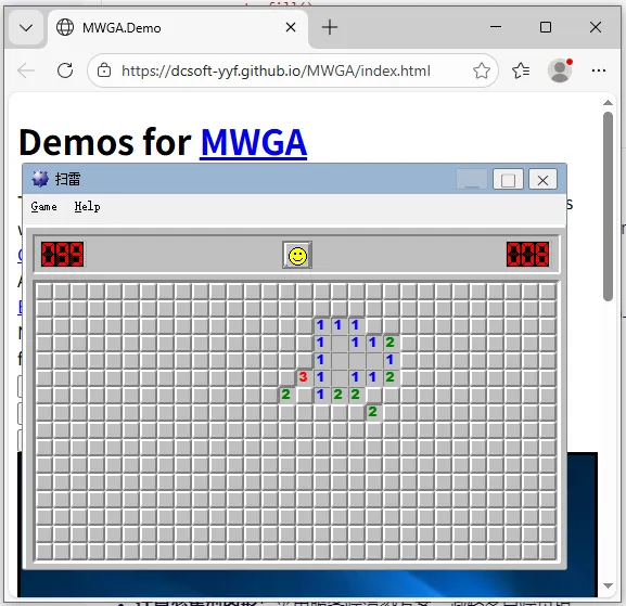 最终我们对旧代码修改了不超过50行(占比2%)就让同一套代码可以无需修改即可编译成.exe和.wasm文件。最后编译成.wasm的扫雷程序在谷歌浏览器中的运行结果如下: