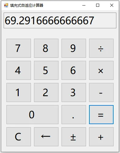 private void CalculatorForm_Resize(object sender, EventArgs e){ UpdateControlLayout();}/// <summary>/// 动态更新所有控件的位置和大小(完全填充窗体,无空白)/// </summary>private void UpdateControlLayout(){ // 获取窗体客户端区域(排除边框) Rectangle clientRect = this.ClientRectangle; // 1. 处理显示屏(占顶部整行,高度占客户端区域的1/6,剩余部分给按钮) int displayHeight = clientRect.Height / 6; // 显示屏位置:左、上、右间距为fixedPadding,高度为displayHeight txtDisplay.Location = new Point(_fixedPadding, _fixedPadding); var newSize = new Size(clientRect.Width - 2 * _fixedPadding, displayHeight - 2 * _fixedPadding); // ...}