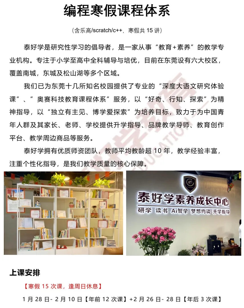 泰好学教育将根据学生学情差异,定制个性化教学方案,助力东莞学子高效冲刺升学目标 / 深耕编程能力。