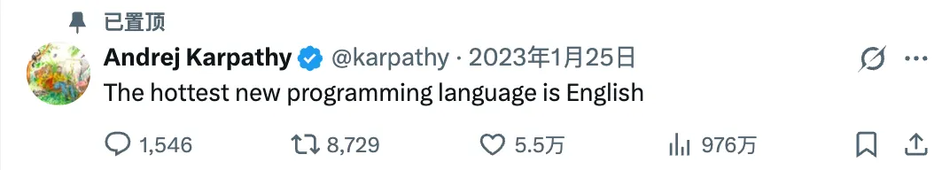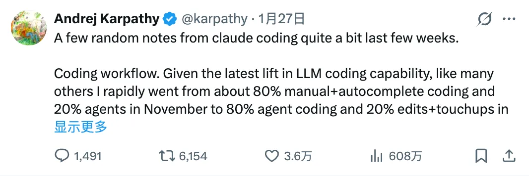 Andrej Karpathy 这两天发推,分享过去几周大量使用 Claude Code 的一些笔记,超过 600 万人学习。内容不长,但「一如既往,观点深刻、逻辑缜密」(Claude Code 之父 Boris Cherny 的评论)。马斯克更是盛赞,这是对时代精神的最佳总结(Sums up the zeitgeist).Karpathy 说, LLM Agent (尤其是 Claude 和 Codex)在 2025 年 12 月跨越了连贯性鸿沟,并引发了 Coding 领域的一次跃迁。这个跃迁的标志是:人类和 AI 写代码的比例从 8:2 逆转成 2:8。Karpathy 说他现在主要用英语编程(I really am mostly programming in English now)——有意思的是,如果你关注 Karpathy 的推特,会发现这正是他当年的预言:2023 年 1 月 25 日,Karpathy 发推「The hottest new programming language is English」(最热门的新编程语言是英语)Karpathy 认为,这种跃迁带来的不仅是编程速度、韧性的提升,更是能力边界、编程趣味性/创造性的提升。主要作用还不是「让原来要做的事更快完成了」,而是「做了更多原来不会做的事」。同时,Karpathy 也非常敏锐地预判了 2026 年既是创造爆炸之年,也是 AI 电子垃圾之年——无论是 AI 内容,还是大部分流于炒作的生产力工具。——非常认可,虽然我大概率也是其中之一,但仍然感觉大部分人高估了「人人都可以做产品」的实际价值。Karpathy 推测,应该有两位数百分比的工程师已经在适应这种新的 AI Coding 工作方式,但普通人几乎对此毫无感知。而 2026 年,或早或晚,整个行业、所有人都将会面对这股全新力量的冲击。内容实在太精彩,我读了很多遍,决定翻译并分享给大家。有很多感受和细节,应该深入 Vibe Coding 过的同学都能心领神会,也难怪马斯克说是对时代精神的最佳总结(Sums up the zeitgeist),enjoy: