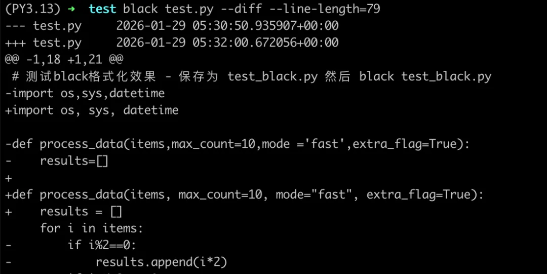 这种“偏执”保证了,经过 Black 格式化的同一份的代码,在你的电脑、我的电脑、服务器上都一模一样,连一个空格都不差。