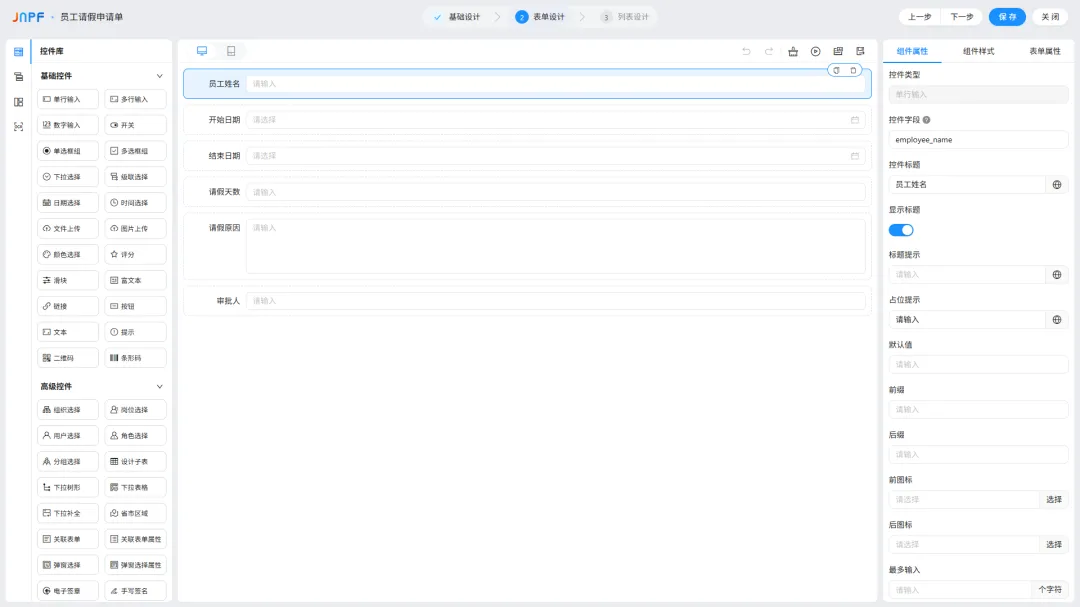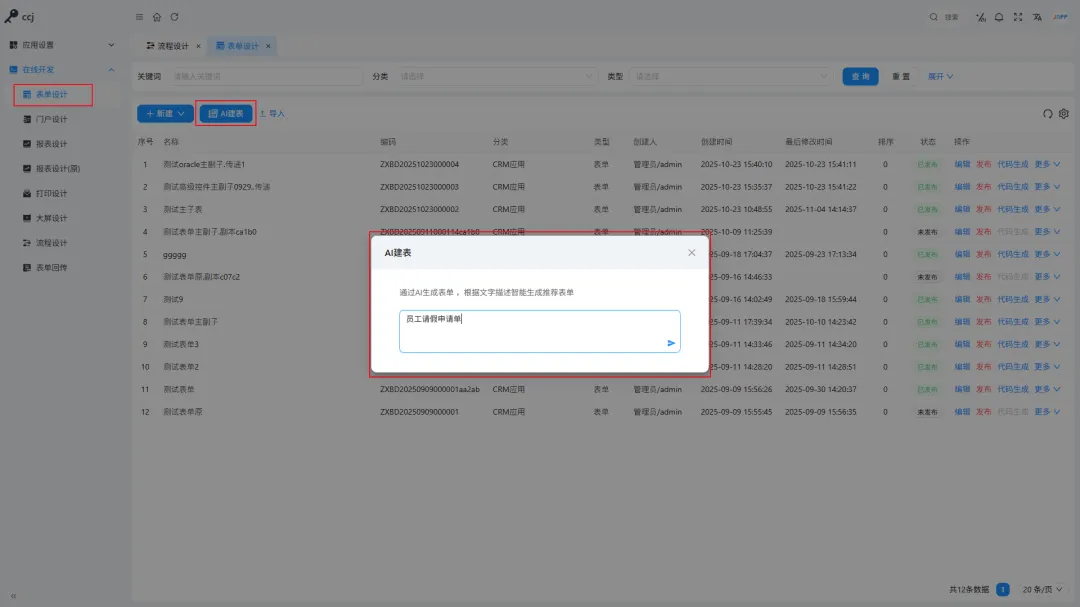 在表单设计页面点击 “AI 建表”,输入 “员工请假申请单”,AI 快速生成包含员工姓名(单行输入)、开始/结束日期(日期选择)、请假天数(数字输入)、请假原因(多行输入)等字段的表单,用户稍作调整即可使用。