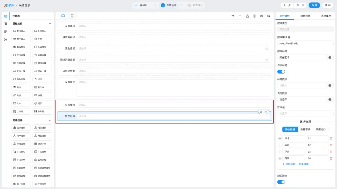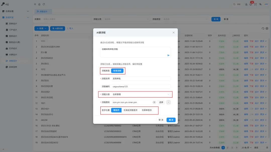 设计 “采购信息表” 时,点击 “AI 生成字段”,输入 “加仓库编号、所在区域字段”,AI 推荐“仓库编号(单行输入)”“所在区域(下拉选择)”,勾选后自动添加到表单,无需手动查找配置。