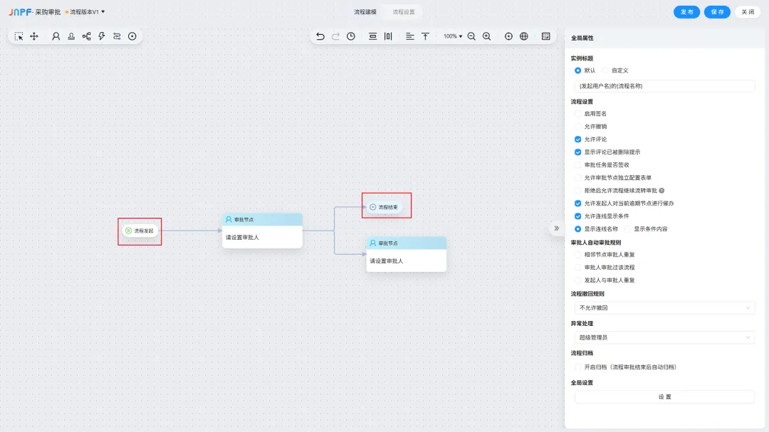 创建 “采购审批流程”,输入“创建采购审批流程”,AI 生成包含流程所需节点的流程图,设置好流转条件,即可快速搭建采购审批流程。