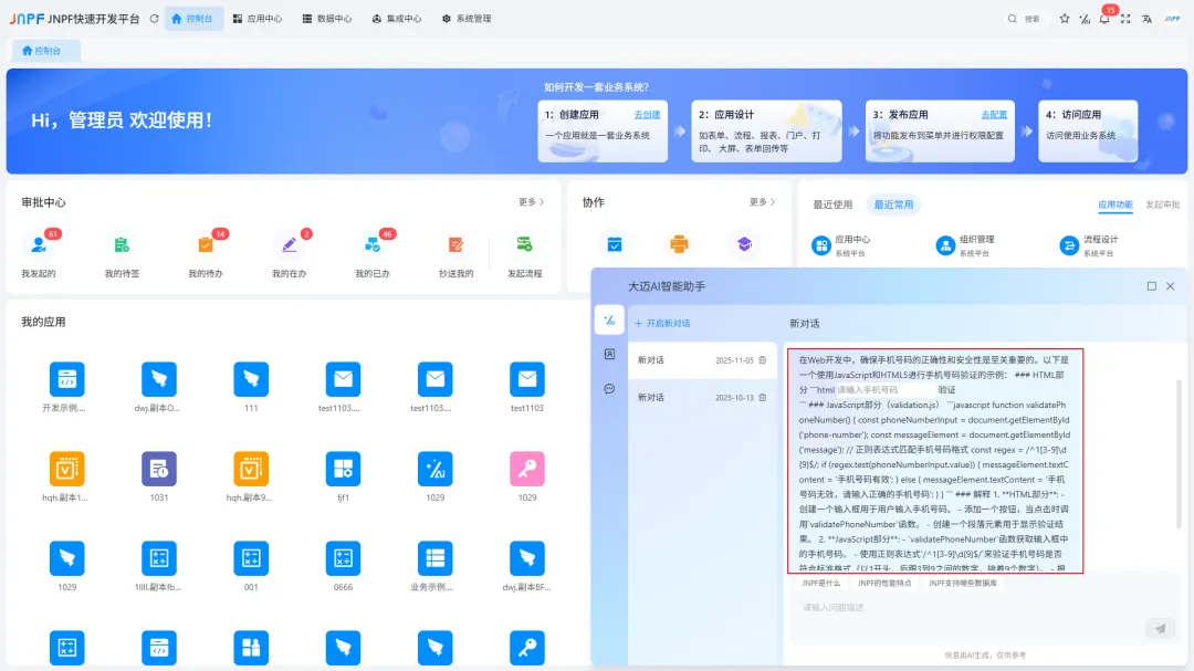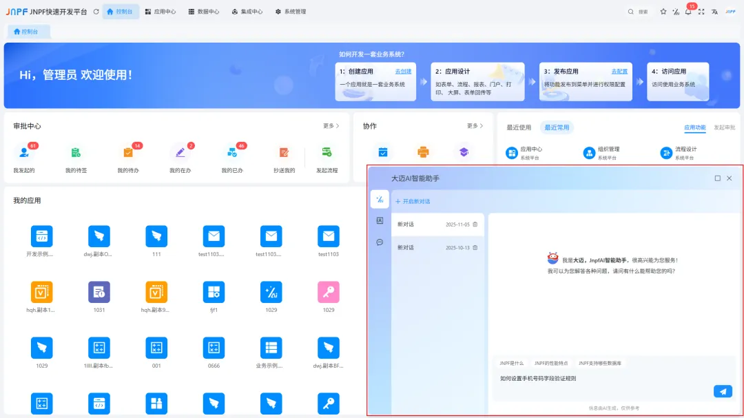 JNPF快速开发平台在低代码的基础上,引入了先进的AI技术,实现了AI与低代码的深度融合。