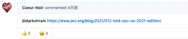 看热闹不嫌事大的网友,之前特地将 JWZ 的博客网址发到了 GitHub 的 bug 报告下,还 at 了相关维护人员。