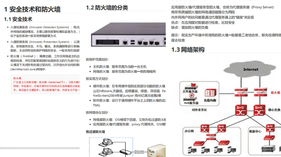这部分介绍了什么是防火墙,防火墙分类又可以分为主机防火墙、网络层防火墙、硬件防火墙。