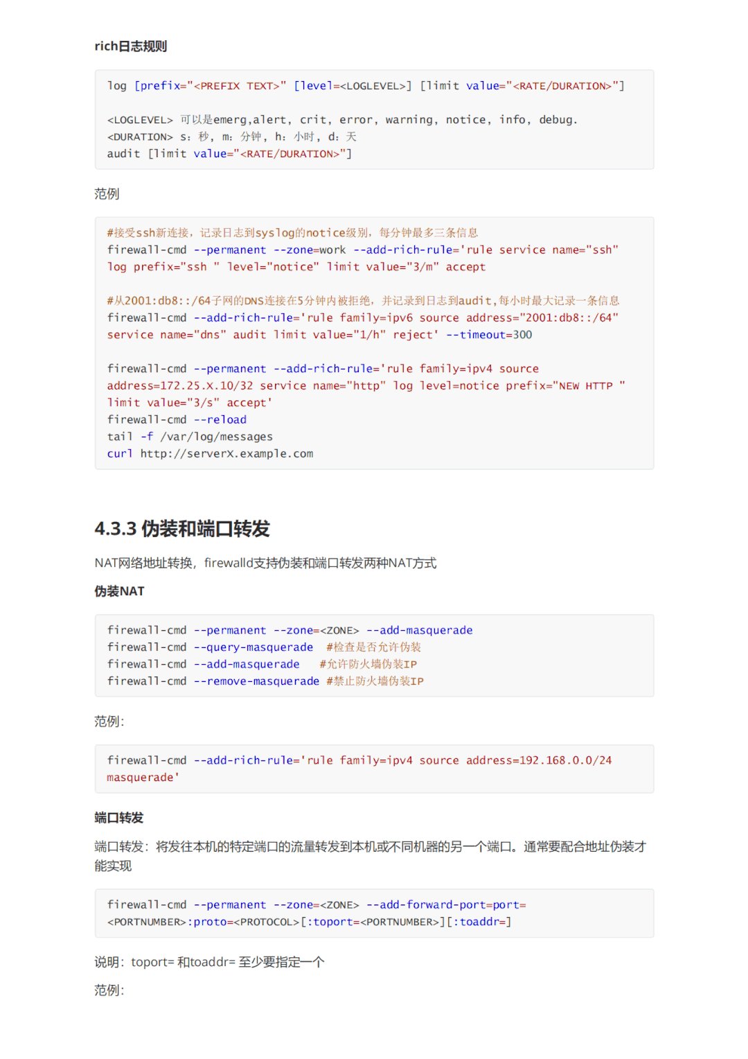 rich规则比基本的firewalld语法实现更强的功能,不仅实现允许/拒绝,还可以实现日志syslog和auditd,也可以实现端口转发,伪装和限制速率。