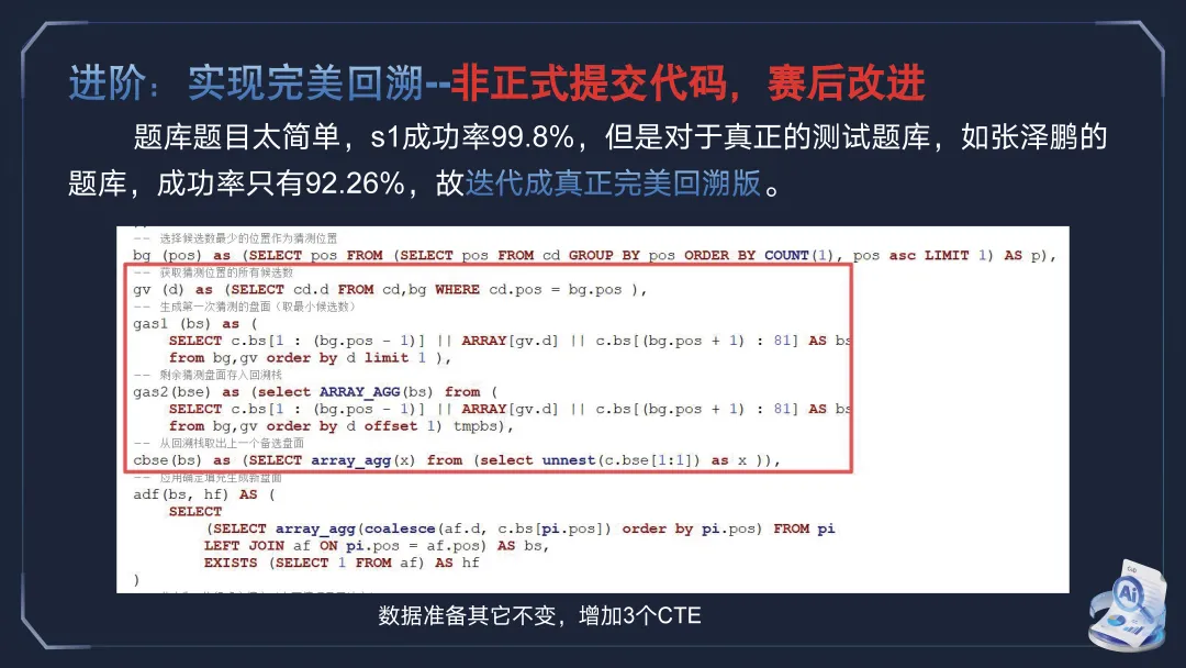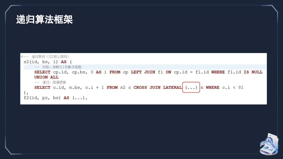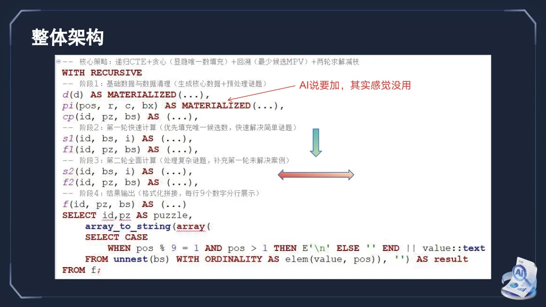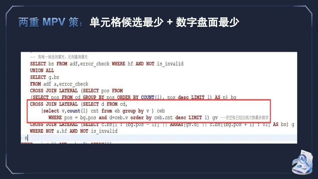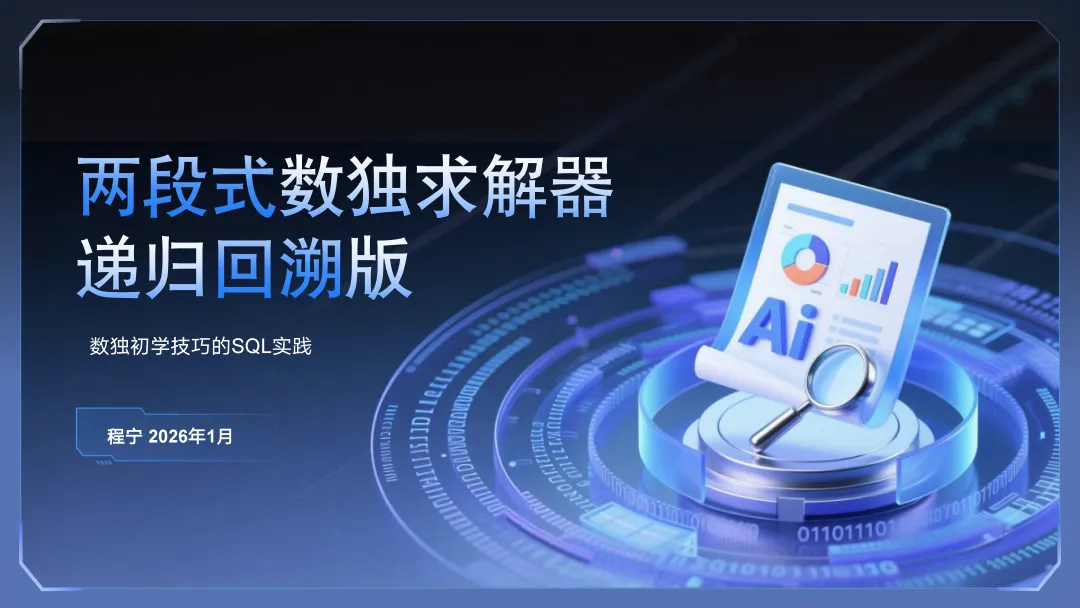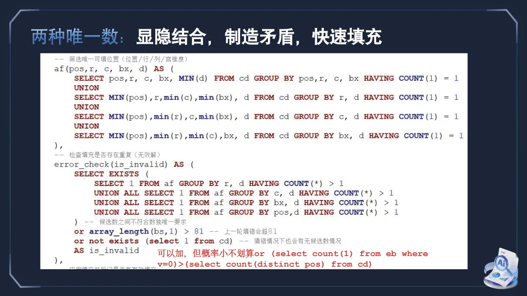 -- PostgreSQL数独求解:减枝策略:两轮计算、显隐唯一数填充、候选数MPV--EXPLAIN (ANALYZE, TIMING ON)WITH RECURSIVE-- 生成1-9有效数字d(d) AS MATERIALIZED(SELECT generate_series(1, 9)),-- 生成81个位置的行/列/宫编号(pos:1-81, r:1-9, c:1-9, bx:1-9)pi(pos, r, c, bx) AS MATERIALIZED(SELECTpos,((pos - 1) / 9) + 1 AS r,((pos - 1) % 9) + 1 AS c,((pos - 1) / 9) / 3 * 3 + ((pos - 1) % 9) / 3 + 1 AS bxFROM generate_series(1, 81) AS pos),-- 预处理谜题:去空白、?转0、转为整数数组cp(id, pz, bs) AS (SELECTid,puzzle,regexp_split_to_array(regexp_replace(regexp_replace(puzzle, '[\r\n\s]', '', 'g'), '\?', '0', 'g'),'')::int[] AS bsFROM sudoku9_9),-- 第一轮递归:优先唯一候选数填充,无则猜测最少候选位置s1(id, bs, i ) AS (SELECT id, bs, 0 AS i FROM cpUNION ALLSELECT c.id, n.bs, c.i + 1 AS iFROM s1 cCROSS JOIN LATERAL (WITHeb(pos, r, c, bx, v) AS (SELECT pi.pos, pi.r, pi.c, pi.bx, c.bs[pi.pos] FROM pi),-- 计算空白位置合法候选数cd(pos, r, c, bx, d) AS (SELECT e.pos, e.r, e.c, e.bx, d.dFROM eb e CROSS JOIN d dWHERE e.v = 0AND NOT EXISTS (SELECT 1 FROM eb e2 WHERE e2.r = e.r AND e2.v = d.d)AND NOT EXISTS (SELECT 1 FROM eb e2 WHERE e2.c = e.c AND e2.v = d.d)AND NOT EXISTS (SELECT 1 FROM eb e2 WHERE e2.bx = e.bx AND e2.v = d.d)),-- 筛选唯一可填位置(位置/行/列/宫维度)af(pos,r, c, bx, d) AS (SELECT pos,r, c, bx, MIN(d) FROM cd GROUP BY pos,r, c, bx HAVING COUNT(1) = 1UNIONSELECT MIN(pos),r,min(c),min(bx), d FROM cd GROUP BY r, d HAVING COUNT(1) = 1UNIONSELECT MIN(pos),min(r),c,min(bx), d FROM cd GROUP BY c, d HAVING COUNT(1) = 1UNIONSELECT MIN(pos),min(r),min(c),bx, d FROM cd GROUP BY bx, d HAVING COUNT(1) = 1),-- 检查填充是否存在重复(无效解)error_check(is_invalid) AS (SELECT EXISTS (SELECT 1 FROM af GROUP BY r, d HAVING COUNT(*) > 1UNION ALL SELECT 1 FROM af GROUP BY c, d HAVING COUNT(*) > 1UNION ALL SELECT 1 FROM af GROUP BY bx, d HAVING COUNT(*) > 1UNION ALL SELECT 1 FROM af GROUP BY pos,d HAVING COUNT(*) > 1) AS is_invalid),-- 应用填充并标记是否有有效填充adf(bs, hf) AS (SELECT(SELECT array_agg(coalesce(af.d, c.bs[pi.pos]) order by pi.pos) FROM pi LEFT JOIN af ON pi.pos = af.pos) AS bs,EXISTS (SELECT 1 FROM af) AS hf)-- 有唯一候选则填充,无效则返回标记数组,无则猜测填充SELECT bs FROM adf,error_check WHERE hf AND NOT is_invalidUNION ALLSELECT g.bsFROM adf a,error_checkCROSS JOIN LATERAL (SELECT pos FROM (SELECT pos FROM cd GROUP BY pos ORDER BY COUNT(1), pos desc LIMIT 1) AS p) bgCROSS JOIN LATERAL (SELECT d FROM cd,(select v,count(1) cnt from eb group by v ) cebWHERE pos = bg.pos and d=ceb.v order by ceb.cnt desc LIMIT 1) gv --该空格已经出现次数最多数字CROSS JOIN LATERAL (SELECT c.bs[1 : (bg.pos - 1)] || ARRAY[gv.d] || c.bs[(bg.pos + 1) : 81] AS bs) gWHERE NOT a.hf AND NOT is_invalid) nWHERE c.i < 81 AND c.bs @> ARRAY[0]),-- 第一轮求解结果(已完成的数独)f1(id, pz, bs) AS (SELECT s.id, cp.pz, s.bsFROM s1 s JOIN cp ON s.id = cp.idWHERE NOT s.bs @> ARRAY[0]),-- 第二轮递归:处理第一轮未解决的谜题(原理同S1)s2(id, bs, i) AS (SELECT cp.id, cp.bs, 0 AS iFROM cp LEFT JOIN f1 ON cp.id = f1.idWHERE f1.id IS NULLUNION ALLSELECT c.id, n.bs, c.i + 1 AS iFROM s2 cCROSS JOIN LATERAL (WITHeb(pos, r, c, bx, v) AS (SELECT pi.pos, pi.r, pi.c, pi.bx, c.bs[pi.pos] FROM pi),cd(pos, r, c, bx, d) AS (SELECT e.pos, e.r, e.c, e.bx, d.dFROM eb e CROSS JOIN d dWHERE e.v = 0AND NOT EXISTS (SELECT 1 FROM eb e2 WHERE e2.r = e.r AND e2.v = d.d)AND NOT EXISTS (SELECT 1 FROM eb e2 WHERE e2.c = e.c AND e2.v = d.d)AND NOT EXISTS (SELECT 1 FROM eb e2 WHERE e2.bx = e.bx AND e2.v = d.d)),af(pos,r, c, bx, d) AS (SELECT pos,r, c, bx, MIN(d) FROM cd GROUP BY pos,r, c, bx HAVING COUNT(1) = 1UNIONSELECT MIN(pos),r,min(c),min(bx), d FROM cd GROUP BY r, d HAVING COUNT(1) = 1UNIONSELECT MIN(pos),min(r),c,min(bx), d FROM cd GROUP BY c, d HAVING COUNT(1) = 1UNIONSELECT MIN(pos),min(r),min(c),bx, d FROM cd GROUP BY bx, d HAVING COUNT(1) = 1),error_check(is_invalid) AS (SELECT EXISTS (SELECT 1 FROM af GROUP BY r, d HAVING COUNT(*) > 1UNION ALL SELECT 1 FROM af GROUP BY c, d HAVING COUNT(*) > 1UNION ALL SELECT 1 FROM af GROUP BY bx, d HAVING COUNT(*) > 1UNION ALL SELECT 1 FROM af GROUP BY pos,d HAVING COUNT(*) > 1) AS is_invalid),adf(bs, hf) AS (SELECT(SELECT array_agg(coalesce(af.d, c.bs[pi.pos]) order by pi.pos) FROM pi LEFT JOIN af ON pi.pos = af.pos) AS bs,EXISTS (SELECT 1 FROM af) AS hf)SELECT bs FROM adf,error_check WHERE hf AND NOT is_invalidUNION ALLSELECT g.bsFROM adf a,error_checkCROSS JOIN LATERAL (SELECT pos FROM (SELECT pos FROM cd GROUP BY pos ORDER BY COUNT(1), pos desc LIMIT 1) AS p) bgCROSS JOIN LATERAL (SELECT d FROM cd WHERE pos = bg.pos) gvCROSS JOIN LATERAL (SELECT c.bs[1 : (bg.pos - 1)] || ARRAY[gv.d] || c.bs[(bg.pos + 1) : 81] AS bs) gWHERE NOT a.hf AND NOT is_invalid) nWHERE c.i < 81 AND c.bs @> ARRAY[0]),-- 合并两轮结果:取每个谜题的最新完成解f2(id, pz, bs) AS (SELECT DISTINCT ON (s.id)s.id, cp.pz, s.bsFROM s2 sJOIN cp ON s.id = cp.idWHERE NOT s.bs @> ARRAY[0]),f(id, pz, bs) AS (select id,pz,bs from f1union allselect id,pz,bs from f2)-- 格式化输出:每行9个数字,换行分隔SELECTid,pz AS puzzle,array_to_string(array(SELECT CASE WHEN pos % 9 = 1 AND pos > 1 THEN E'\n' ELSE '' END || value::textFROM unnest(bs) WITH ORDINALITY AS elem(value, pos)),'') AS resultFROM f;