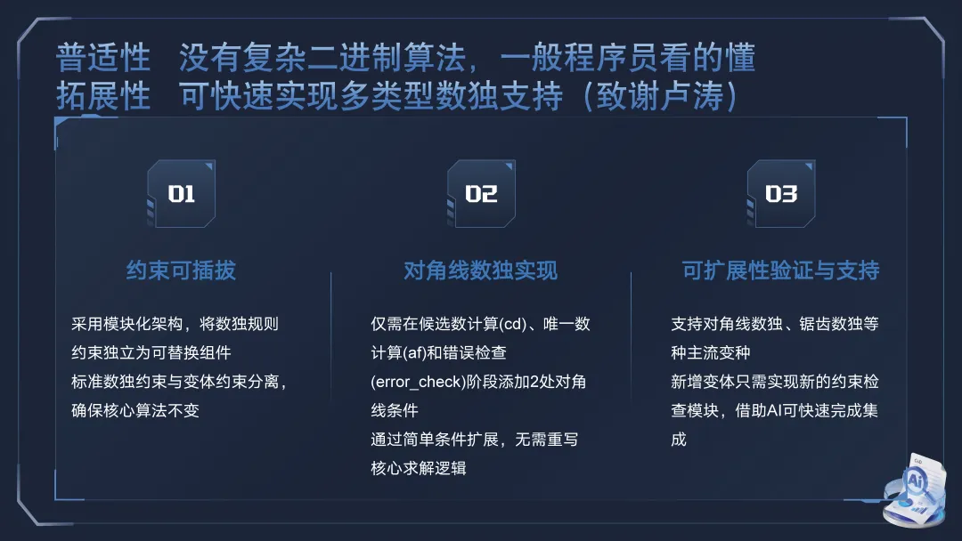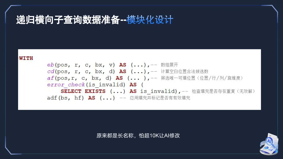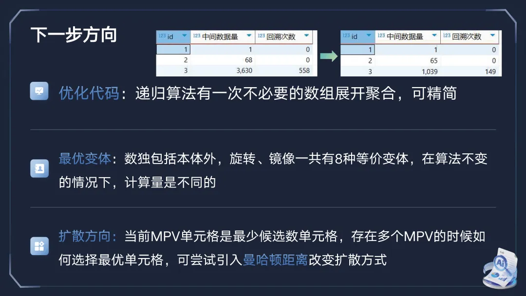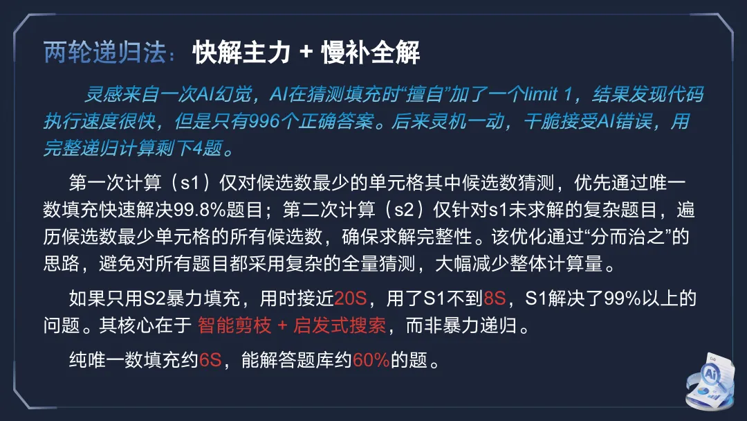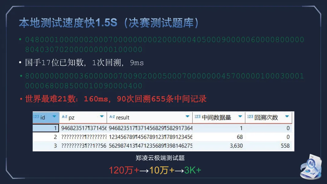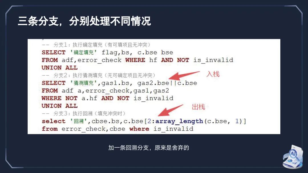-- PostgreSQL数独求解:减枝策略:两轮计算、显隐唯一数填充、候选数MPV--EXPLAIN (ANALYZE, TIMING ON)WITH RECURSIVE-- 生成1-9有效数字d(d) AS MATERIALIZED(SELECT generate_series(1, 9)),-- 生成81个位置的行/列/宫编号(pos:1-81, r:1-9, c:1-9, bx:1-9)pi(pos, r, c, bx) AS MATERIALIZED(SELECTpos,((pos - 1) / 9) + 1 AS r,((pos - 1) % 9) + 1 AS c,((pos - 1) / 9) / 3 * 3 + ((pos - 1) % 9) / 3 + 1 AS bxFROM generate_series(1, 81) AS pos),-- 预处理谜题:去空白、?转0、转为整数数组cp(id, pz, bs) AS (SELECTid,puzzle,regexp_split_to_array(regexp_replace(regexp_replace(puzzle, '[\r\n\s]', '', 'g'), '\?', '0', 'g'),'')::int[] AS bsFROM sudoku9_9),-- 第一轮递归:优先唯一候选数填充,无则猜测最少候选位置s1(id, bs, i ) AS (SELECT id, bs, 0 AS i FROM cpUNION ALLSELECT c.id, n.bs, c.i + 1 AS iFROM s1 cCROSS JOIN LATERAL (WITHeb(pos, r, c, bx, v) AS (SELECT pi.pos, pi.r, pi.c, pi.bx, c.bs[pi.pos] FROM pi),-- 计算空白位置合法候选数cd(pos, r, c, bx, d) AS (SELECT e.pos, e.r, e.c, e.bx, d.dFROM eb e CROSS JOIN d dWHERE e.v = 0AND NOT EXISTS (SELECT 1 FROM eb e2 WHERE e2.r = e.r AND e2.v = d.d)AND NOT EXISTS (SELECT 1 FROM eb e2 WHERE e2.c = e.c AND e2.v = d.d)AND NOT EXISTS (SELECT 1 FROM eb e2 WHERE e2.bx = e.bx AND e2.v = d.d)),-- 筛选唯一可填位置(位置/行/列/宫维度)af(pos,r, c, bx, d) AS (SELECT pos,r, c, bx, MIN(d) FROM cd GROUP BY pos,r, c, bx HAVING COUNT(1) = 1UNIONSELECT MIN(pos),r,min(c),min(bx), d FROM cd GROUP BY r, d HAVING COUNT(1) = 1UNIONSELECT MIN(pos),min(r),c,min(bx), d FROM cd GROUP BY c, d HAVING COUNT(1) = 1UNIONSELECT MIN(pos),min(r),min(c),bx, d FROM cd GROUP BY bx, d HAVING COUNT(1) = 1),-- 检查填充是否存在重复(无效解)error_check(is_invalid) AS (SELECT EXISTS (SELECT 1 FROM af GROUP BY r, d HAVING COUNT(*) > 1UNION ALL SELECT 1 FROM af GROUP BY c, d HAVING COUNT(*) > 1UNION ALL SELECT 1 FROM af GROUP BY bx, d HAVING COUNT(*) > 1UNION ALL SELECT 1 FROM af GROUP BY pos,d HAVING COUNT(*) > 1) AS is_invalid),-- 应用填充并标记是否有有效填充adf(bs, hf) AS (SELECT(SELECT array_agg(coalesce(af.d, c.bs[pi.pos]) order by pi.pos) FROM pi LEFT JOIN af ON pi.pos = af.pos) AS bs,EXISTS (SELECT 1 FROM af) AS hf)-- 有唯一候选则填充,无效则返回标记数组,无则猜测填充SELECT bs FROM adf,error_check WHERE hf AND NOT is_invalidUNION ALLSELECT g.bsFROM adf a,error_checkCROSS JOIN LATERAL (SELECT pos FROM (SELECT pos FROM cd GROUP BY pos ORDER BY COUNT(1), pos desc LIMIT 1) AS p) bgCROSS JOIN LATERAL (SELECT d FROM cd,(select v,count(1) cnt from eb group by v ) cebWHERE pos = bg.pos and d=ceb.v order by ceb.cnt desc LIMIT 1) gv --该空格已经出现次数最多数字CROSS JOIN LATERAL (SELECT c.bs[1 : (bg.pos - 1)] || ARRAY[gv.d] || c.bs[(bg.pos + 1) : 81] AS bs) gWHERE NOT a.hf AND NOT is_invalid) nWHERE c.i < 81 AND c.bs @> ARRAY[0]),-- 第一轮求解结果(已完成的数独)f1(id, pz, bs) AS (SELECT s.id, cp.pz, s.bsFROM s1 s JOIN cp ON s.id = cp.idWHERE NOT s.bs @> ARRAY[0]),-- 第二轮递归:处理第一轮未解决的谜题(原理同S1)s2(id, bs, i) AS (SELECT cp.id, cp.bs, 0 AS iFROM cp LEFT JOIN f1 ON cp.id = f1.idWHERE f1.id IS NULLUNION ALLSELECT c.id, n.bs, c.i + 1 AS iFROM s2 cCROSS JOIN LATERAL (WITHeb(pos, r, c, bx, v) AS (SELECT pi.pos, pi.r, pi.c, pi.bx, c.bs[pi.pos] FROM pi),cd(pos, r, c, bx, d) AS (SELECT e.pos, e.r, e.c, e.bx, d.dFROM eb e CROSS JOIN d dWHERE e.v = 0AND NOT EXISTS (SELECT 1 FROM eb e2 WHERE e2.r = e.r AND e2.v = d.d)AND NOT EXISTS (SELECT 1 FROM eb e2 WHERE e2.c = e.c AND e2.v = d.d)AND NOT EXISTS (SELECT 1 FROM eb e2 WHERE e2.bx = e.bx AND e2.v = d.d)),af(pos,r, c, bx, d) AS (SELECT pos,r, c, bx, MIN(d) FROM cd GROUP BY pos,r, c, bx HAVING COUNT(1) = 1UNIONSELECT MIN(pos),r,min(c),min(bx), d FROM cd GROUP BY r, d HAVING COUNT(1) = 1UNIONSELECT MIN(pos),min(r),c,min(bx), d FROM cd GROUP BY c, d HAVING COUNT(1) = 1UNIONSELECT MIN(pos),min(r),min(c),bx, d FROM cd GROUP BY bx, d HAVING COUNT(1) = 1),error_check(is_invalid) AS (SELECT EXISTS (SELECT 1 FROM af GROUP BY r, d HAVING COUNT(*) > 1UNION ALL SELECT 1 FROM af GROUP BY c, d HAVING COUNT(*) > 1UNION ALL SELECT 1 FROM af GROUP BY bx, d HAVING COUNT(*) > 1UNION ALL SELECT 1 FROM af GROUP BY pos,d HAVING COUNT(*) > 1) AS is_invalid),adf(bs, hf) AS (SELECT(SELECT array_agg(coalesce(af.d, c.bs[pi.pos]) order by pi.pos) FROM pi LEFT JOIN af ON pi.pos = af.pos) AS bs,EXISTS (SELECT 1 FROM af) AS hf)SELECT bs FROM adf,error_check WHERE hf AND NOT is_invalidUNION ALLSELECT g.bsFROM adf a,error_checkCROSS JOIN LATERAL (SELECT pos FROM (SELECT pos FROM cd GROUP BY pos ORDER BY COUNT(1), pos desc LIMIT 1) AS p) bgCROSS JOIN LATERAL (SELECT d FROM cd WHERE pos = bg.pos) gvCROSS JOIN LATERAL (SELECT c.bs[1 : (bg.pos - 1)] || ARRAY[gv.d] || c.bs[(bg.pos + 1) : 81] AS bs) gWHERE NOT a.hf AND NOT is_invalid) nWHERE c.i < 81 AND c.bs @> ARRAY[0]),-- 合并两轮结果:取每个谜题的最新完成解f2(id, pz, bs) AS (SELECT DISTINCT ON (s.id)s.id, cp.pz, s.bsFROM s2 sJOIN cp ON s.id = cp.idWHERE NOT s.bs @> ARRAY[0]),f(id, pz, bs) AS (select id,pz,bs from f1union allselect id,pz,bs from f2)-- 格式化输出:每行9个数字,换行分隔SELECTid,pz AS puzzle,array_to_string(array(SELECT CASE WHEN pos % 9 = 1 AND pos > 1 THEN E'\n' ELSE '' END || value::textFROM unnest(bs) WITH ORDINALITY AS elem(value, pos)),'') AS resultFROM f;