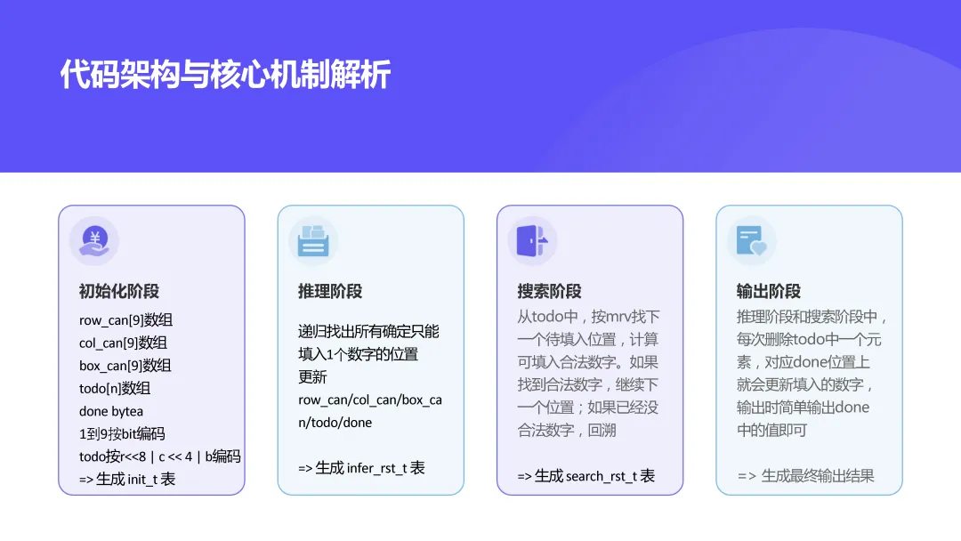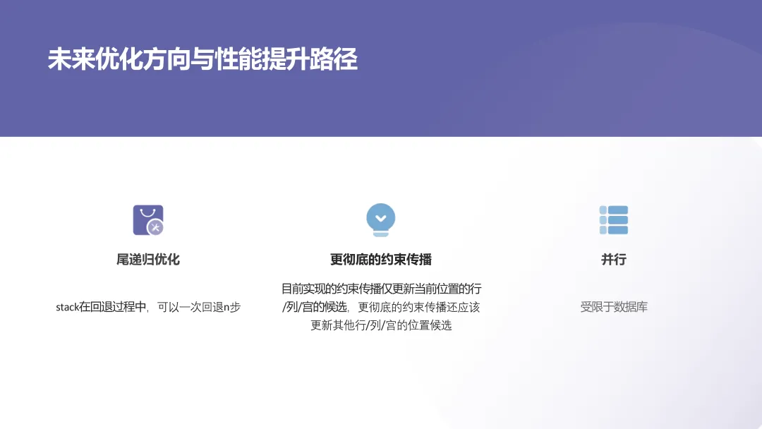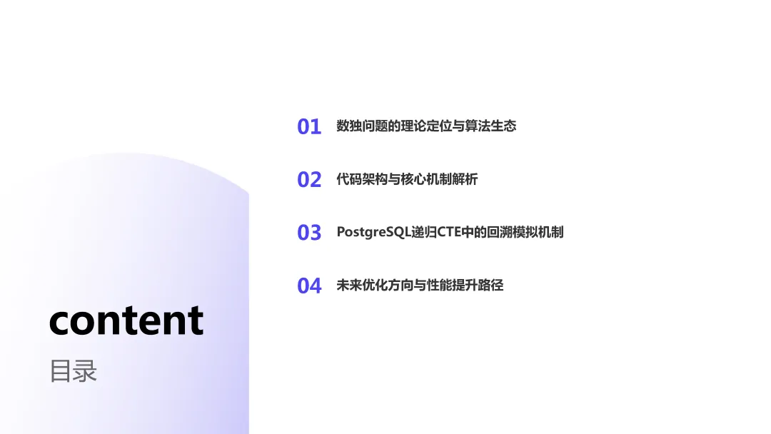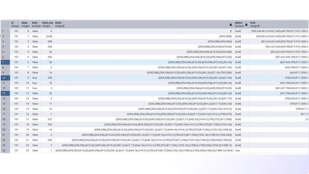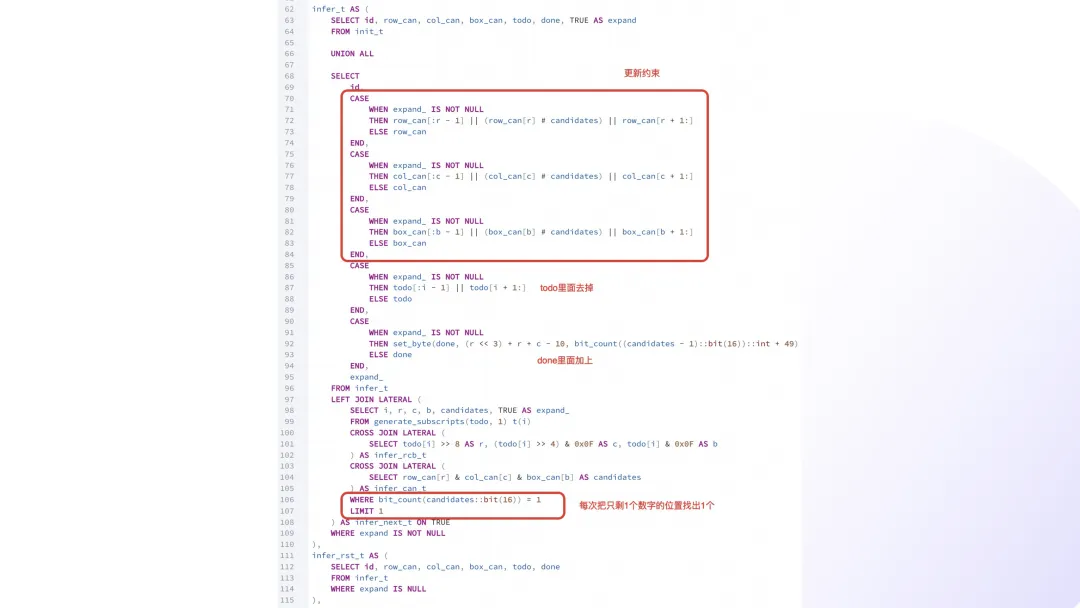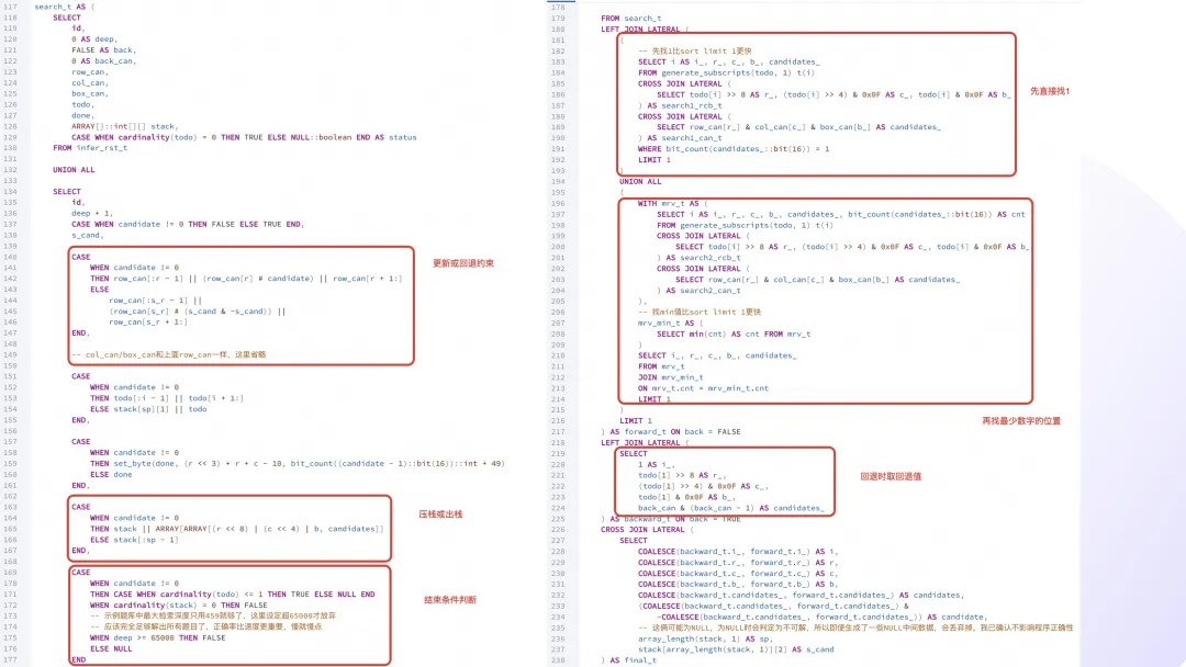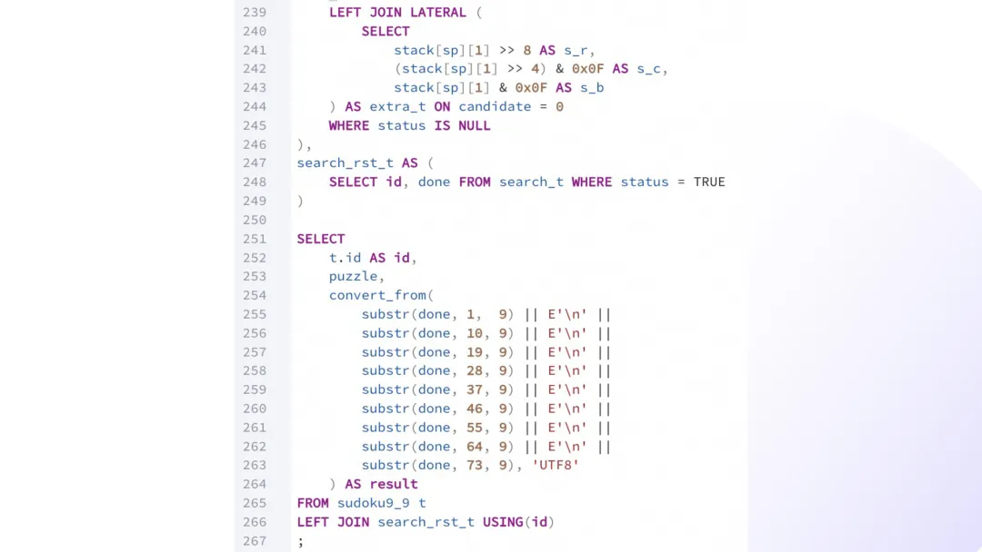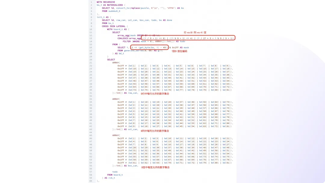 with recursive coordinates as materialized (selectrow * 9 + col + 1 as id,row,col,row / 3 * 3 + col / 3 as boxfromgenerate_series(0, 8) as rs(row),generate_series(0, 8) as cs(col)), propagations as materialized (selectsources.id as coordinate_id,bit_or(bitshiftright(set_bit(0::bit(729), 0, 1), (targets.id - 1) * 9)) as targetsfromcoordinates as sourcesinner joincoordinates as targetsonsources.row = targets.rowor sources.col = targets.color sources.box = targets.boxgroup bysources.id), cells as materialized (selectid,coordinate_id::int as coordinate_id,digitfromsudoku9_9 as sudoku,unnest(string_to_array(replace(replace(puzzle, E'\n', ''), '?', '0'), null)::int[]) with ordinality as _(digit, coordinate_id)), almosts as materialized (selectcells.id,bitnot(bit_or(bitshiftright(propagations.targets, cells.digit - 1))) as candidatesfromcellsinner joinpropagationsoncells.coordinate_id = propagations.coordinate_idand cells.digit != 0group bycells.id), constraints as materialized (selectcells.id,cells.coordinate_id,set_bit(set_bit(set_bit(overlay(b'000000000000000000000000000000000000' placing substring(almosts.candidates from (cells.coordinate_id - 1) * 9 + 1 for 9) from 1 for 9), coordinates.row + 9, 1), coordinates.col + 18, 1), coordinates.box + 27, 1) as candidatesfromcellsinner joinalmostsoncells.id = almosts.idand cells.digit = 0inner joincoordinatesoncells.coordinate_id = coordinates.id), puzzles as (selectconstraints.id,count(distinct constraints.coordinate_id) as size,'{}'::int[] as solution,array_agg(set_bit(set_bit(set_bit(constraints.candidates, coordinates.row + 9, 1), coordinates.col + 18, 1), coordinates.box + 27, 1) order by bit_count(constraints.candidates)) as candidatesfromconstraintsinner joincoordinatesonconstraints.coordinate_id = coordinates.idgroup byconstraints.idunion allselectid,size,array_append(solution,casewhen get_bit(candidates[1], 9) = 1 then 100when get_bit(candidates[1], 10) = 1 then 200when get_bit(candidates[1], 11) = 1 then 300when get_bit(candidates[1], 12) = 1 then 400when get_bit(candidates[1], 13) = 1 then 500when get_bit(candidates[1], 14) = 1 then 600when get_bit(candidates[1], 15) = 1 then 700when get_bit(candidates[1], 16) = 1 then 800else 900end+ casewhen get_bit(candidates[1], 18) = 1 then 10when get_bit(candidates[1], 19) = 1 then 20when get_bit(candidates[1], 20) = 1 then 30when get_bit(candidates[1], 21) = 1 then 40when get_bit(candidates[1], 22) = 1 then 50when get_bit(candidates[1], 23) = 1 then 60when get_bit(candidates[1], 24) = 1 then 70when get_bit(candidates[1], 25) = 1 then 80else 90end+ digit + 1) as solution,array(selectcasewhenget_bit(candidate, digit) = 1and bit_count(candidates[1] & candidate & b'000000000111111111111111111111111111') > 0thenset_bit(candidate, digit, 0)elsecandidateend as candidatefromunnest(candidates[2:]) as _(candidate)order bybit_count(candidate)) as candidatesfrompuzzles,(values (0), (1), (2), (3), (4), (5), (6), (7), (8)) as _(digit)wherecardinality(candidates) > 0and bit_count(candidates[1]) > 3and get_bit(candidates[1], digit) = 1), solutions as (selectdistinct on (id)id,array(selectcandidate % 10fromunnest(solution) as _(candidate)order bycandidate) as solutionfrompuzzleswherecardinality(solution) = size)selectsudoku.id,sudoku.puzzle,format(replace(sudoku.puzzle, '?', '%s'), variadic solutions.solution) as resultfromsudoku9_9 as sudokuinner joinsolutionsonsudoku.id = solutions.id