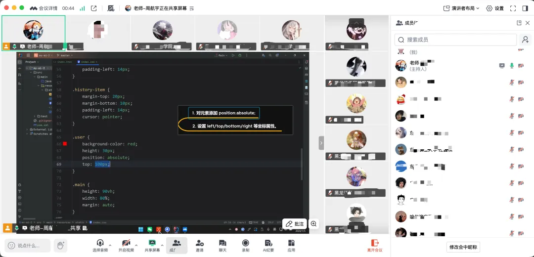 云端集结,开启沉浸式学习之旅。本次训练营采用线上直播授课的形式,打破空间限制,让热爱技术的学员们足不出户就能对接优质教学资源。从清晨的代码晨练到深夜的项目复盘,线上课堂始终氛围浓厚。屏幕那头,授课老师凭借扎实的专业功底和生动的讲解方式,将复杂的技术知识点拆解细化,从Java的面向对象编程思想,到算法的逻辑推导与优化技巧,从C/C++的底层语法运用,到网络安全的攻防核心要点,每一处细节都讲解得透彻易懂。屏幕这头,学员们全神贯注,时而凝神思考,时而快速记录,有的还不忘及时截图留存重点内容,生怕错过任何关键知识点。这些线上上课的截图,定格了学员们求知若渴的模样,也见证了码动科技高效有序的线上教学实力。