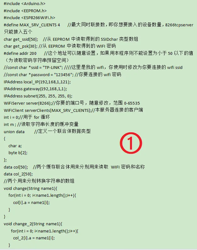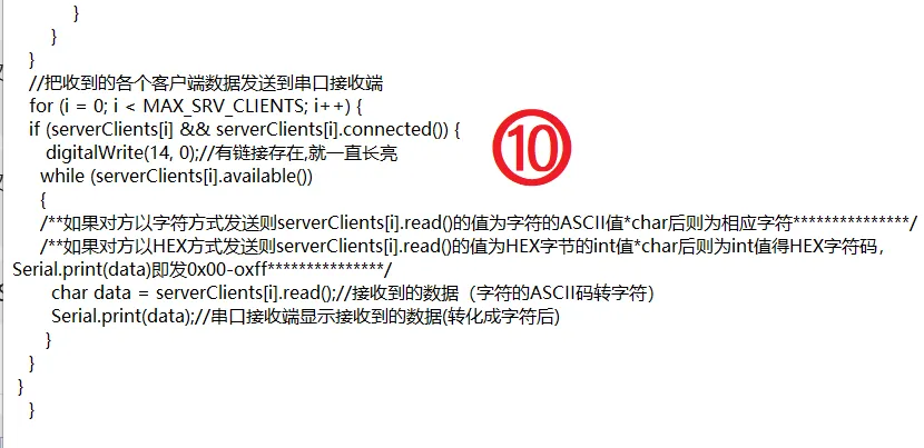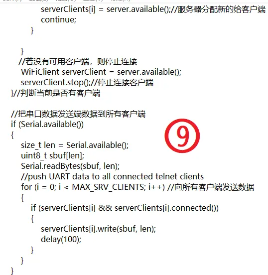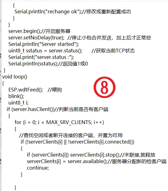 •定义MAX_SRV_CLIENTS=4(可修改,ESP8266最大支持5个),创建WiFiClient serverClients[MAX_SRV_CLIENTS]数组,管理所有连接的客户端;