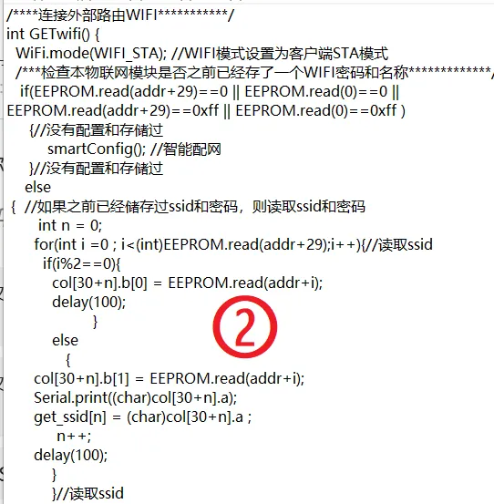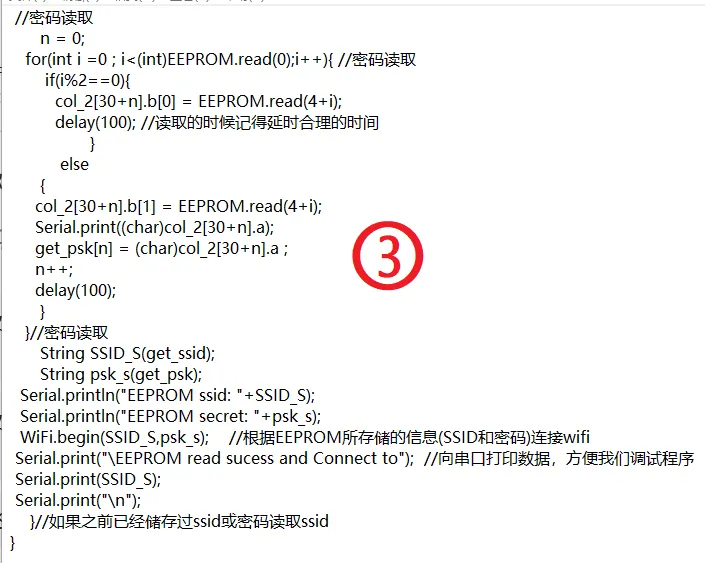 // 检查EEPROM中是否有有效WIFI信息,无则进入智能配网 if(EEPROM.read(addr+29)==0 || EEPROM.read(0)==0 || ... ){ smartConfig(); // 首次配网/信息失效时触发 }else{ // 读取EEPROM中存储的SSID和密码,自动连接 for(int i =0 ; i<(int)EEPROM.read(addr+29);i++){ // 按字节读取SSID,存入get_ssid数组 col[30+n].b[0] = EEPROM.read(addr+i); ... get_ssid[n] = (char)col[30+n].a ; } WiFi.begin(SSID_S,psk_s); // 自动连接 } |