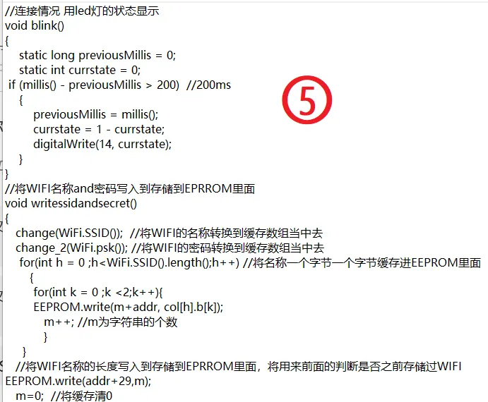 ○配网成功后,代码通过writessidandsecret()函数,将SSID和密码以字节形式写入ESP8266的EEPROM(相当于模块的“内置小U盘”),地址分别预留在addr=200和addr=4,避免数据冲突;