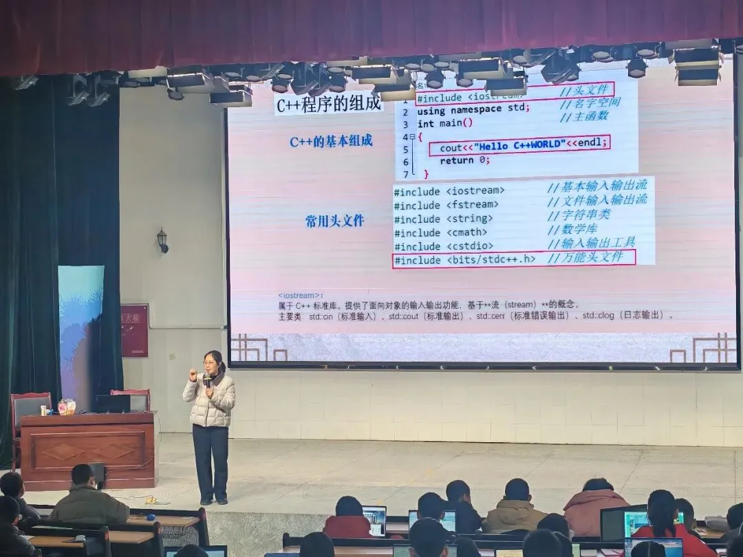 为让抽象的编程知识更易理解,尹洁老师创新性地融入孔子的事例以及德阳本土文化文庙元素设计教学案例。她以孔庙中花草树木的数量统计、大成殿成人礼的流程判断等场景为载体,将代码逻辑转化为贴近生活的实际问题,引导学生在解决具体问题的过程中掌握编程方法。生动的案例讲解、互动式的教学引导,让课堂氛围持续热烈,现场200余名学子专注聆听、认真记录笔记,不少学生主动举手提问,在思维碰撞中深化对知识的理解与吸收。