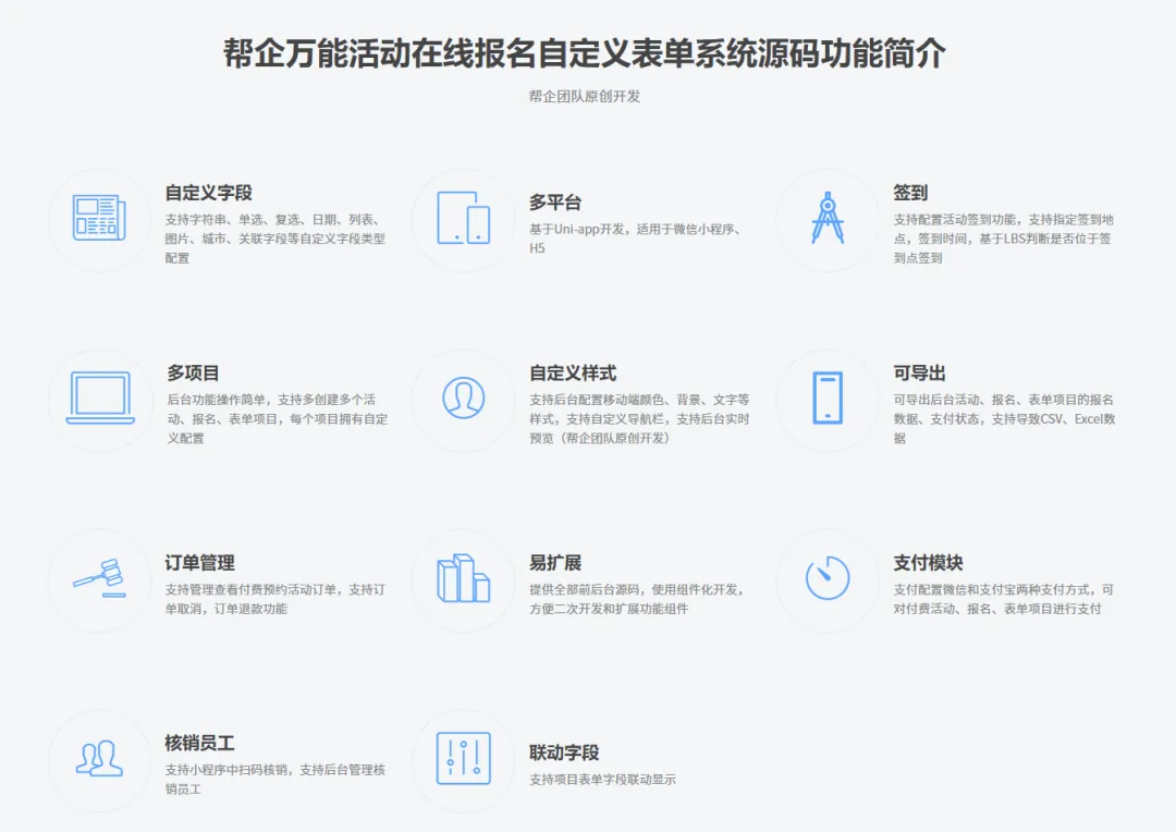 在追求降本增效和数字化自主权的当下,帮企万能活动在线报名自定义表单系统源码,为企业提供了一个兼具强大现成功能与无限扩展潜力的优秀选择。它让高效、安全、个性化的信息收集与管理,不再是大公司的专利,而是任何有需求的组织都能快速拥有并持续优化的核心能力。