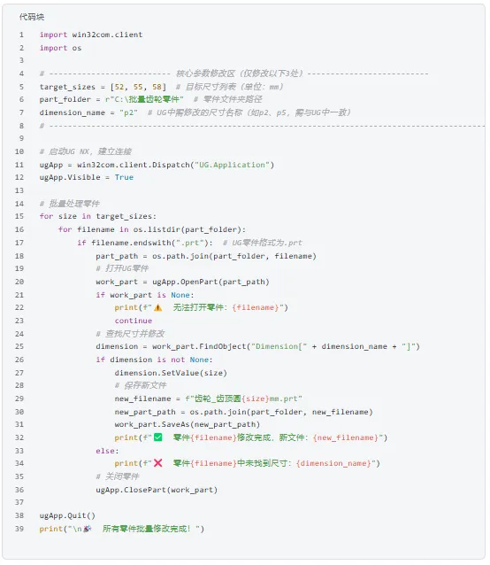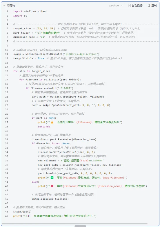 关键提醒:无需担心编程门槛!本文提供的脚本可直接复制套用,只需修改3个核心参数(目标尺寸、零件路径、尺寸名称),无需掌握复杂的Python语法,机械设计师零编程基础也能轻松上手。