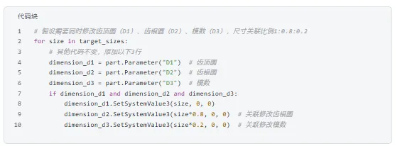 如果需要批量修改多个关联尺寸(比如齿轮的齿顶圆、齿根圆、模数同时修改),无需重复编写脚本,只需在原有脚本中添加少量代码,示例如下(以SolidWorks为例):