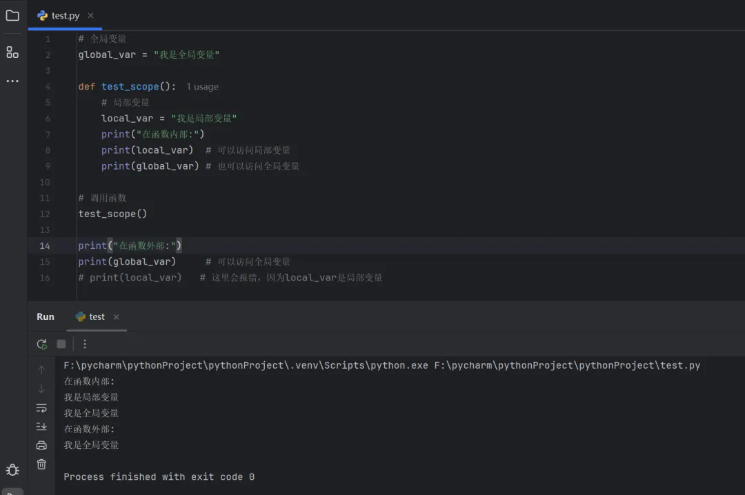 # 全局变量global_var = "我是全局变量"def test_scope(): # 局部变量 local_var = "我是局部变量" print("在函数内部:") print(local_var) # 可以访问局部变量 print(global_var) # 也可以访问全局变量# 调用函数test_scope()print("在函数外部:")print(global_var) # 可以访问全局变量# print(local_var) # 这里会报错,因为local_var是局部变量