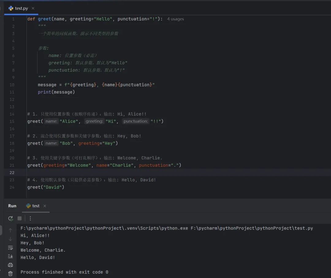 def greet(name, greeting="Hello", punctuation="!"): """ 一个简单的问候函数,演示不同类型的参数 参数: name: 位置参数(必需) greeting: 默认参数,默认为"Hello" punctuation: 默认参数,默认为"!" """ message = f"{greeting}, {name}{punctuation}" print(message)# 1. 只使用位置参数(按顺序传递):输出: Hi, Alice!!greet("Alice", "Hi", "!!") # 2. 混合使用位置参数和关键字参数:输出: Hey, Bob!greet("Bob", greeting="Hey") # 3. 使用关键字参数(可打乱顺序):输出: Welcome, Charlie.greet(greeting="Welcome", name="Charlie", punctuation=".") # 4. 使用默认参数(只提供必需参数):输出: Hello, David!greet("David")