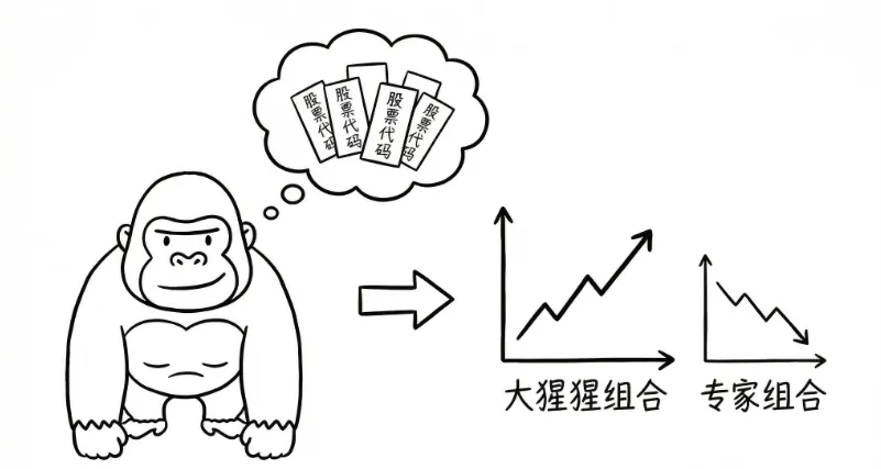 他们是这样用大猩猩做选股实验的:他们让大猩猩随机选择写有股票代码的纸板,一共选择了5只股票,然后用大猩猩挑选的股票组合与《华尔街日报》中8位知名分析师挑选的5只股票相比较,在持有一段时间后,大猩猩随机抽取的股票的票面价值竟超过职业分析师选择的股票的票面价值。表面上看这似乎不太可能,感觉大猩猩运气太好了,但是后来人们在相继的操作中发现一个关键细节,那就是定期卖掉所持有的股票中收益率最差的一只,再让大猩猩随机选择一只股票来买。