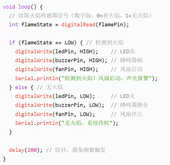 通电后→传感器持续扫火焰→有火:LED亮+蜂鸣器响+风扇转灭火→火灭后:所有零件复位,继续检测。